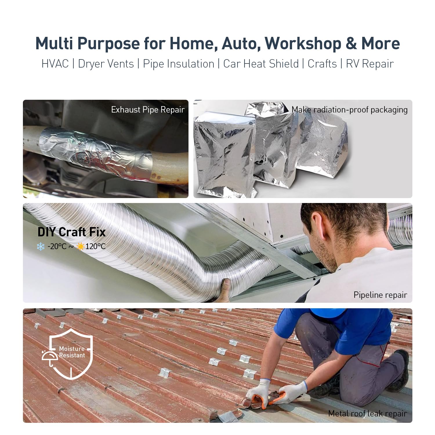 - PREMIUM ALUMINUM FOIL METAL TAPE: This aluminum tape offers excellent waterproofing, UV and moisture resistance, heat and corrosion protection, anti aging, insulation, and flame retardancy. Perfect for sealing seams in any weather, it stays durable and reliable. The metal foil tape resists wrinkling and curling, making ductwork and exhaust repairs easier and faster. An ideal choice for HVAC, dryer vents, vent pipes, metal seams, reflective insulation, copper pipe fixes, and other metal surface applications requiring strong, long lasting performance.