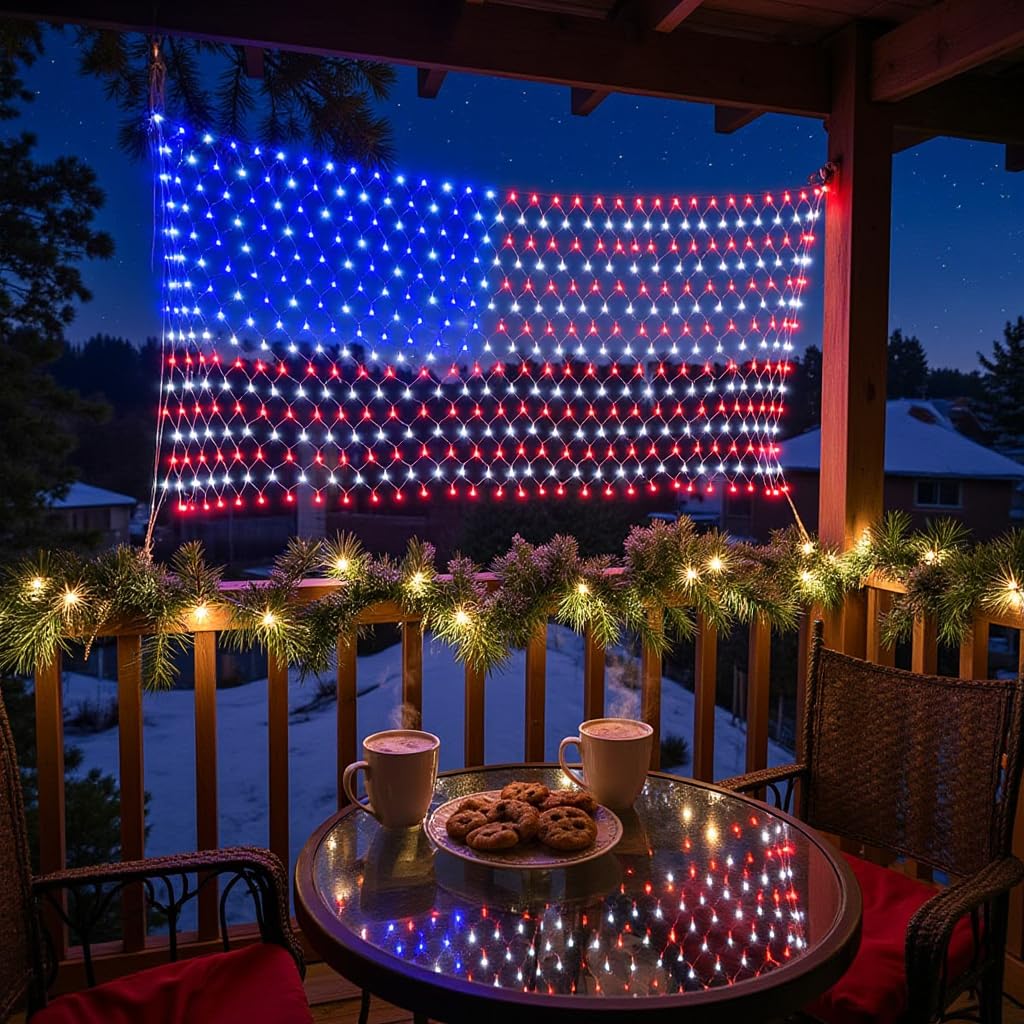 - đăLED American Flag Lightsă: Light up your patriotic moments with this vibrant led American Flag Light. Perfect for 4th of July, Independence Day, Memorial Day, Veterans Day, Christmas and more. Lightweight and portable, easy to hang or lay flatâideal for decoration walls, yards, garages, porches, decks, gardens, ponds, fences, rooftops, windows, and balconies. It can bring a joyful and cozy holiday atmosphere !
