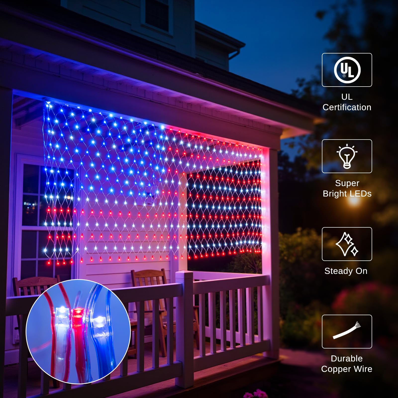 - đăPerfect Style & Sizeă: Outdoor seasonal decorative American flag lights, Extra-Large Size: 6.5 ft Ă 3.3 ft (2 m Ă 1 m), Large Coverage Area. Features 420 Super Bright LED bulbs in classic red, white, and blue, creating a vibrant patriotic atmosphere. Compared to others on the market, ooLALoo led flag lights are much brighterâideal for patriotic lights and festive decor.