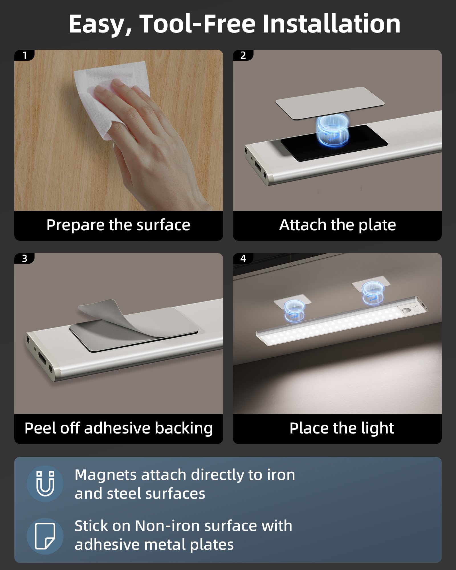 - Tool-free, Punch-free, Easy installation: Our motion sensor lights with the built-in magnet, simply attach the light to any metal surface like your kitchen cabinet, fridge, or shelving unit. For non-metal surfaces, use the included sticky iron plates to mount it on closets, pantries, or hallways. No drilling, no fuss—just quick, reliable lighting wherever you need it.