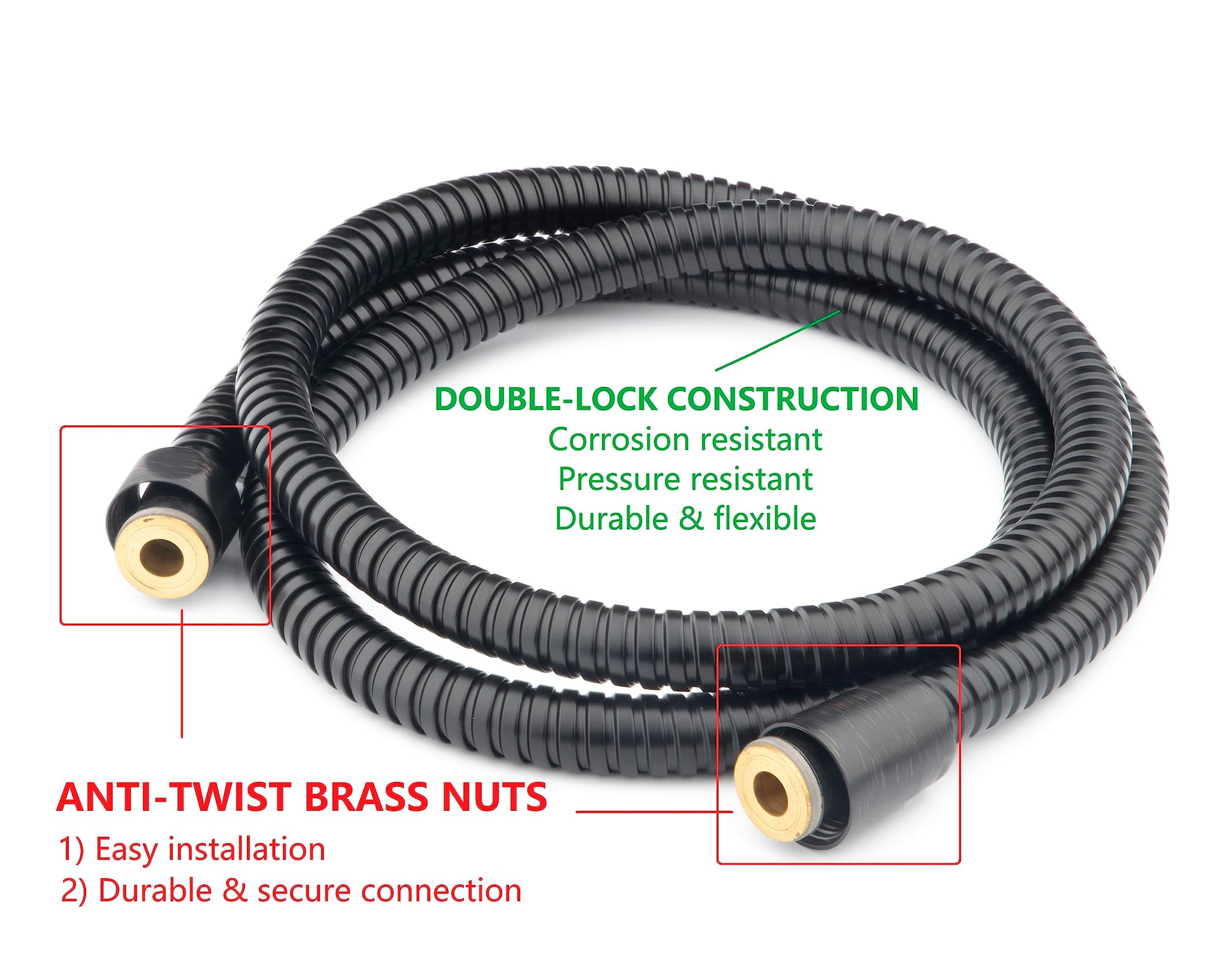 - LONG 5 FT (60 inch) FLEXIBLE STAINLESS STEEL SHOWER HOSE WITH 2 BRASS NUTS: Metal hose with double-lock design and anti-twist brass fittings provide durable and secure connection. Great for washing pets, bathing children, or cleaning bathtubs. / OIL RUBBED BRONZE FINISH: Shower heads are in luxurious ORB finish that delivers a classy, rich, dark brown, and old world touch.