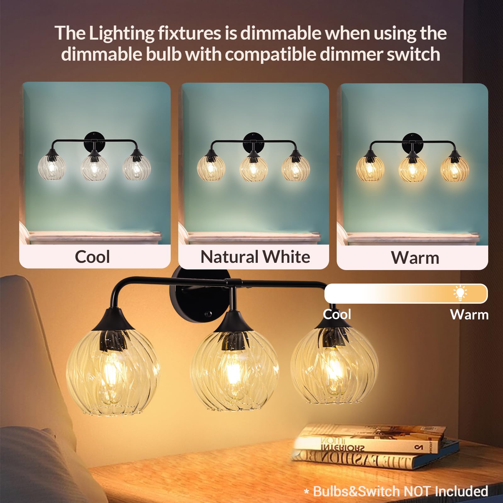 - Bright & Balanced Bathroom Lighting – Three spiral glass shades spread light evenly across your mirror, perfect as bathroom vanity lights over mirror for makeup, shaving, and daily grooming. The glow is bright yet soft, reducing shadows and creating a comfortable bathroom atmosphere