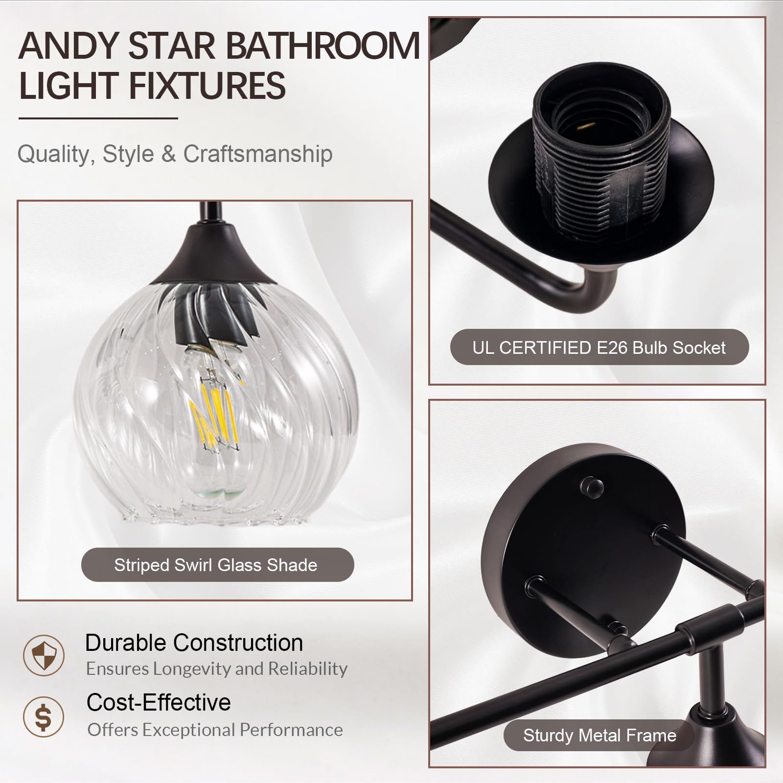 ANDY STAR 3-Light Matte Black Bathroom Vanity Light, 22” Modern Wall Sconce with Clear Spiral Glass Shades, Anti-Rust Metal Lighting Fixture for Bathroom Mirror, Powder Room, E26 Base