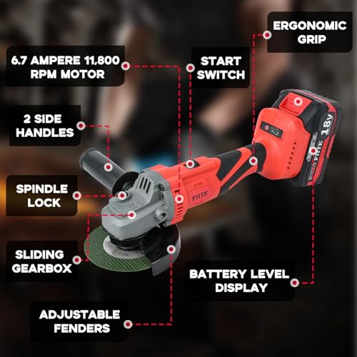 - What Will You Get: FIITE provides you with convenient and practical kits and comprehensive after-sales service! This kit comes with 1 angle grinder, 2 ¡¿ 5.0Ah batteries, 1 quick charger, 1 handle, 1 wheel(4"¡¿1/20"¡¿5/8" - 107¡¿1.2¡¿16 mm), 1 wheel guard, 1 wrench, and a tool kit.