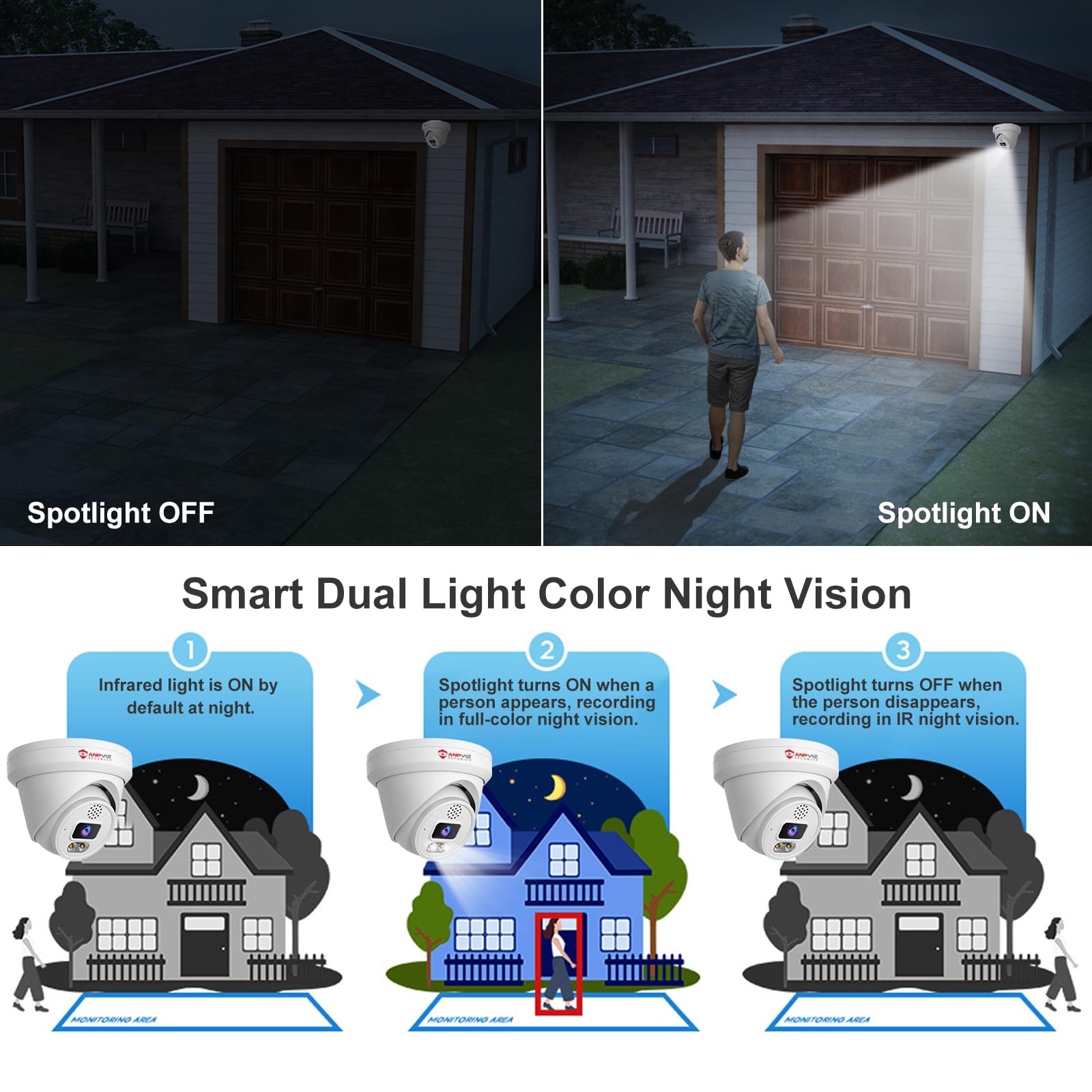 - 【100FT Smart Color Night Vision with Spotlights】This 4K ip poe camera outdoor enables you to view clear images with brilliant color in live video streaming and playback. Once an intruder is detected, the camera’s spotlights and siren will be triggered automatically to warn off the would-be criminal. You could also manually activate the spotlights to stop the crime before it happens. (NDAA Compliant)