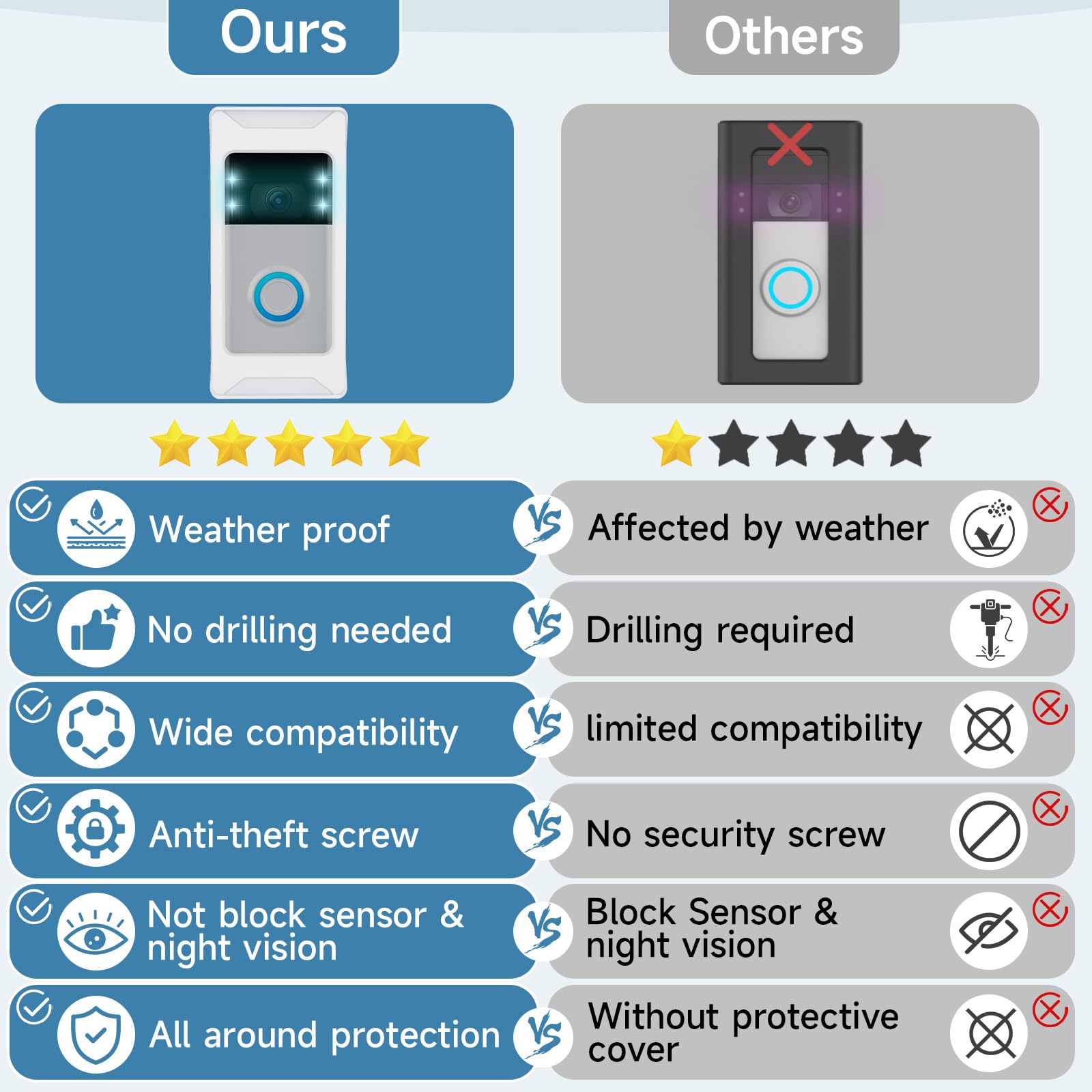 - Comprehensive Protection: Our doorbell mount is made of high-quality plastic, which protects the doorbell from rain and dust, extending its lifespan. Additionally, it features theft-proof capabilities, with the bottom secured by anti-theft screws, so you don’t have to worry about thieves stealing your doorbell.