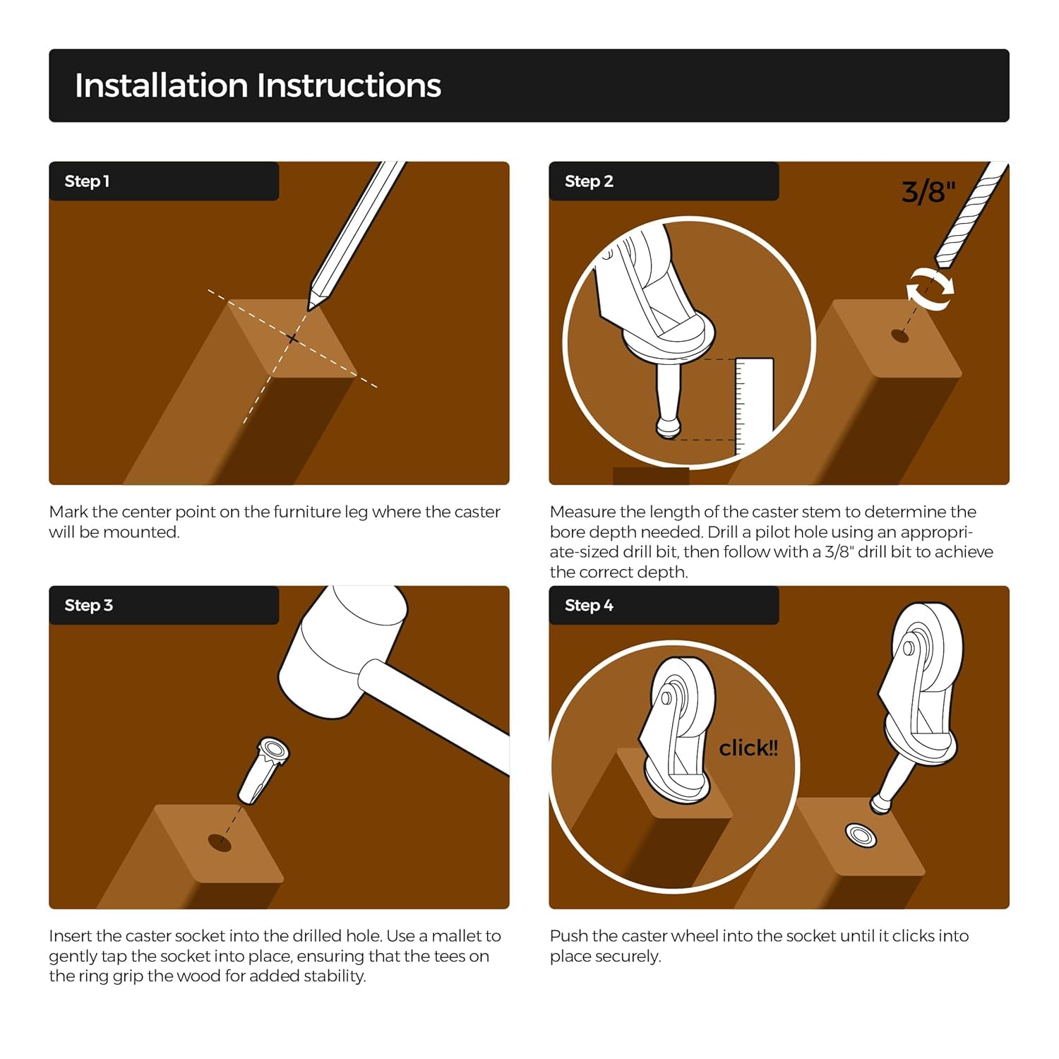 - The package includes four casters with mounting sockets. These wheels feature ball bearings for smooth rotation.
