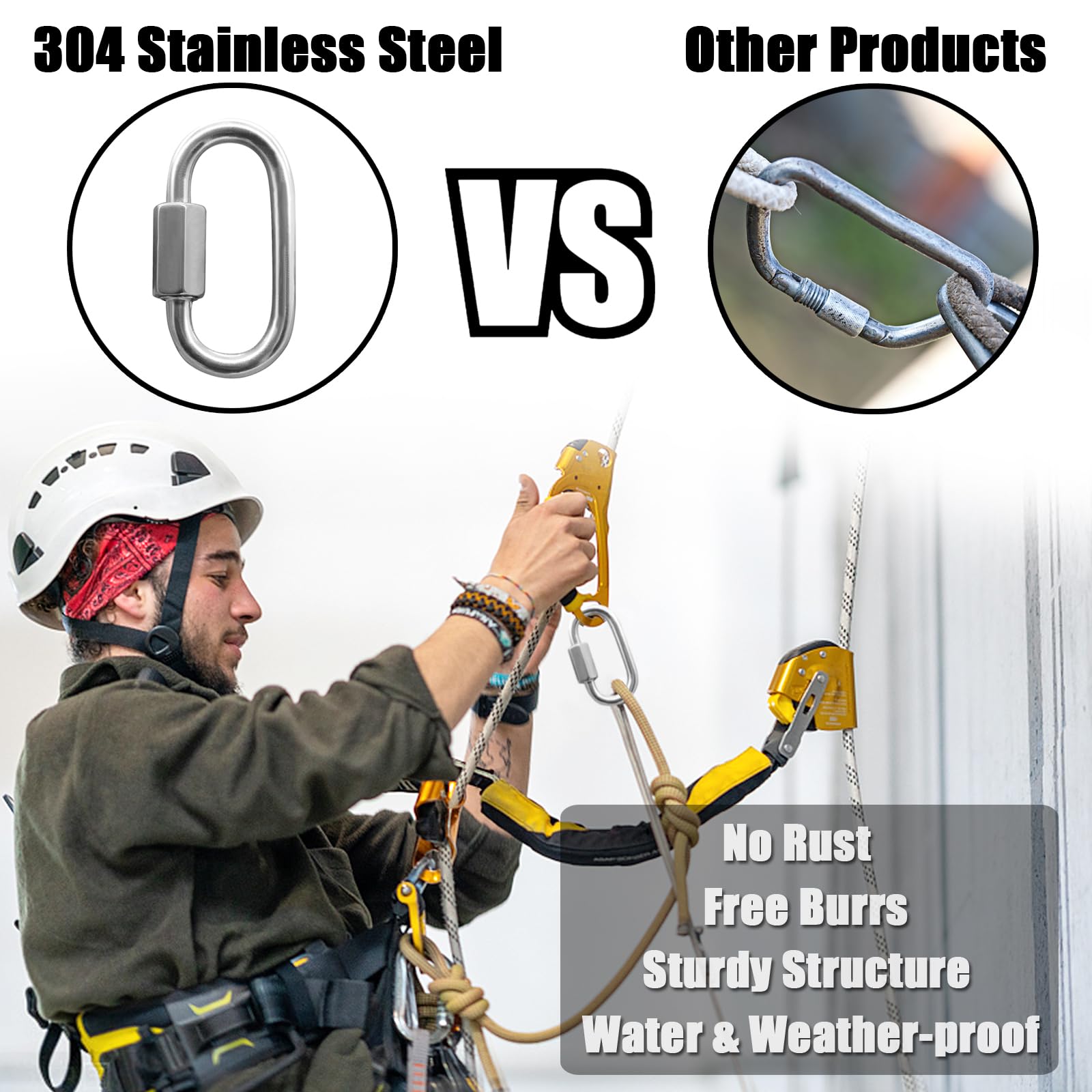 - Durable Material- Made of heavy duty stainless steel, these carabiners are extremely durable and sturdy. Compact design quick link resists corrosion in harsh weather for long periods of use.
