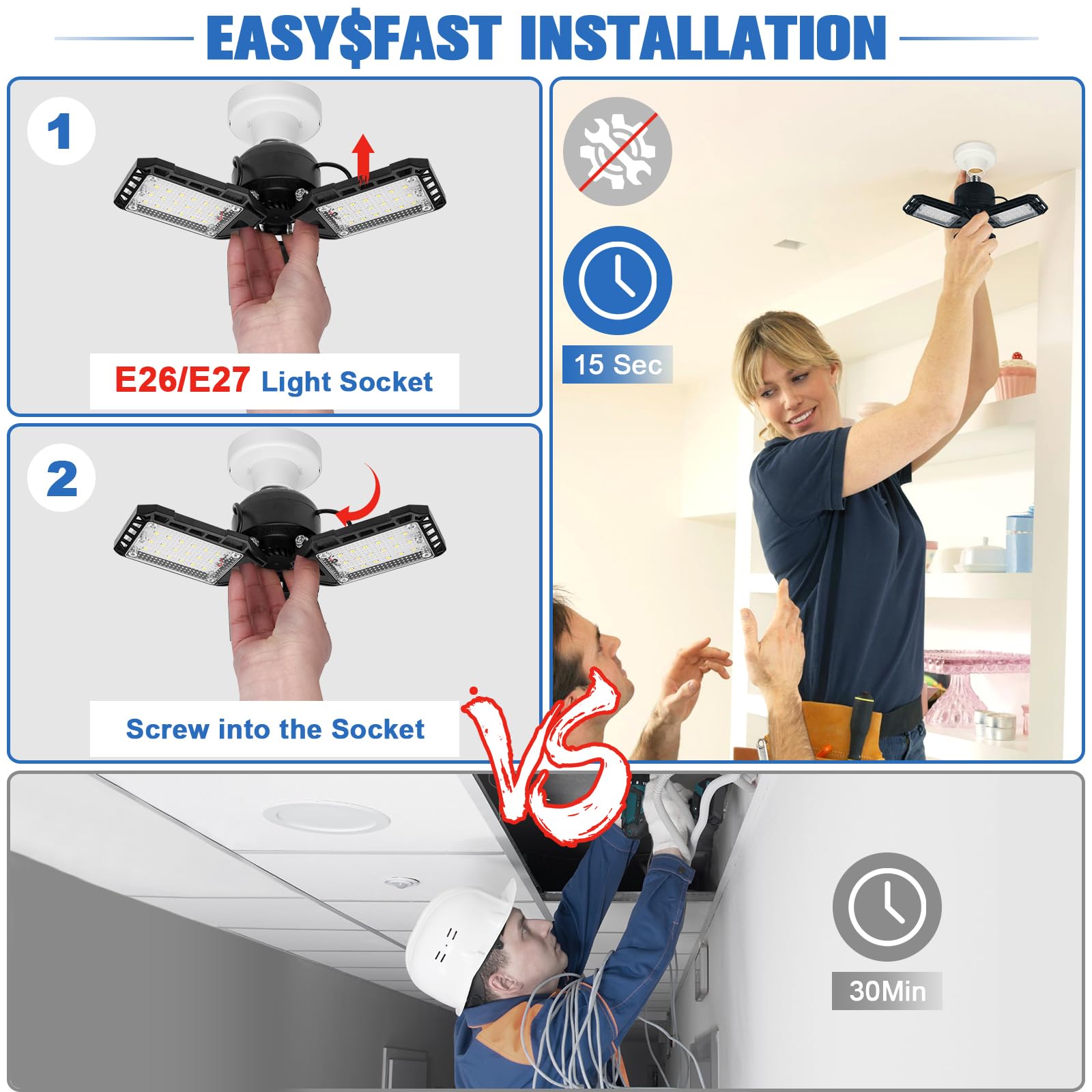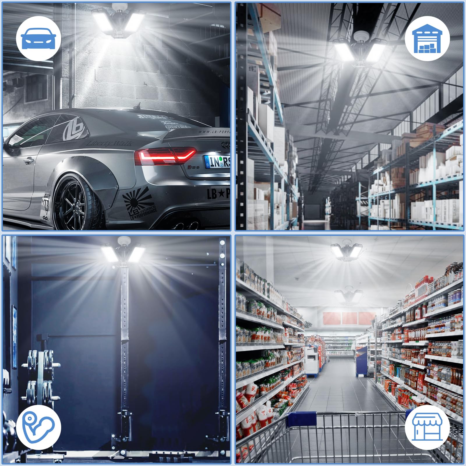 - 【3 Panels Garage Lights】With 3 deformable panels, the best led garage ceiling lights can be adjustable from 0 to 90 degree, which illuminate each corner of your garage in 360 full coverage without visual blind spots and dizziness. The led garage lights 2 pack will provide better light than traditional light bulb