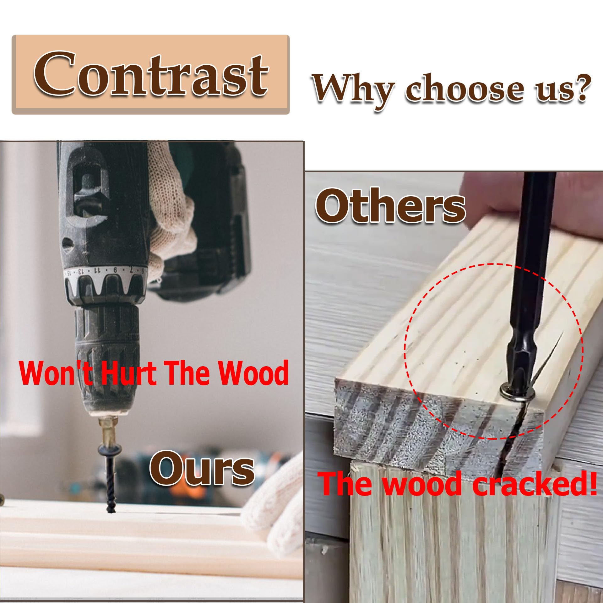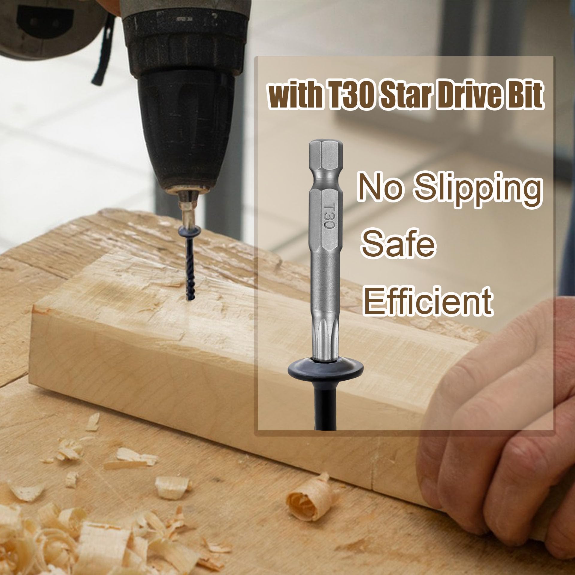 - Easy to Use:The design of knurled handle reduces the torque requirement of drilling, and the ultra-sharp tip of 17-type incision is easier to tighten, so it can be easily used without pre-drilling;The thread is deep and sharp,which makes drilling more convenient and won't damage your wood;The wooden screw adopts T30 star-shaped driving mode,and with T30 drill, it will not slip during use,and the operation is safe and efficient