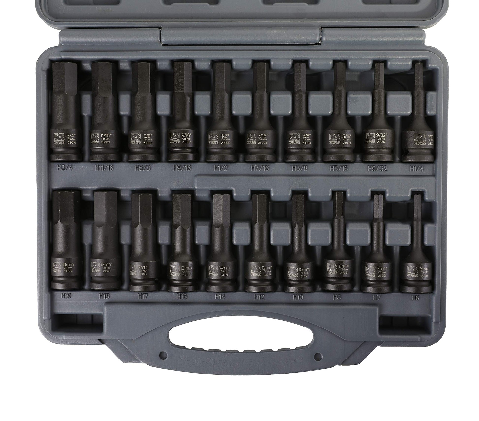 - ITEM SPECIFICATIONS: Our high quality 1/2-inch Drive Impact Hex Driver Socket Set includes 10 SAE impact hex drivers and 10 Metric impact hex drivers in the following sizes: 1/4-inch, 9/32-inch, 5/16-inch, 3/8-inch, 7/16-inch, 1/2-inch, 9/16-inch, 5/8-inch, 11/16-inch, 3/4-inch, 6mm, 7mm, 8mm, 10mm, 12mm, 14mm, 15mm, 17mm, 18mm, and 19mm.