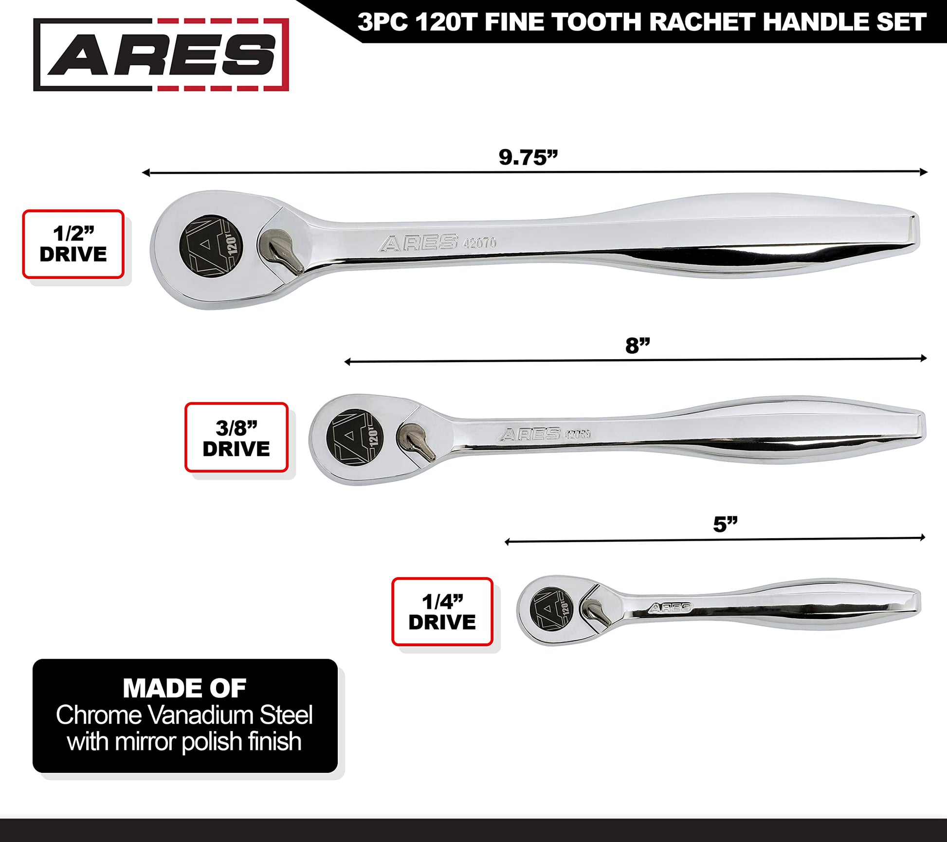 ARES 42067 – 120 Tooth Ratchet Set – 1/4-Inch, 3/8-Inch, and 1/2-Inch Drive - 3 Degree Swing Arc – Reversible Ratcheting Mechanism - Ergonomic Handle and Professional Gear Structure