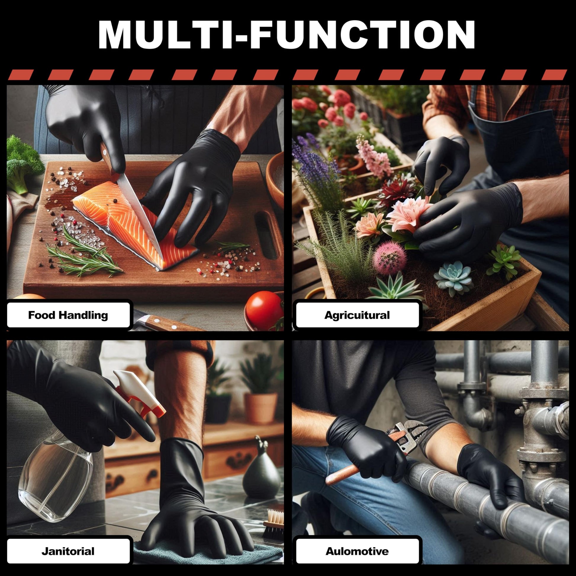 - MULTI-PURPOSE: These Nitrile gloves are suitable for a wide ranfe of use, Including: mechanics, food processing/handling, cleaning, janitorial industries, lab work, tatoo artists, and areas where extra hand protection is needed.