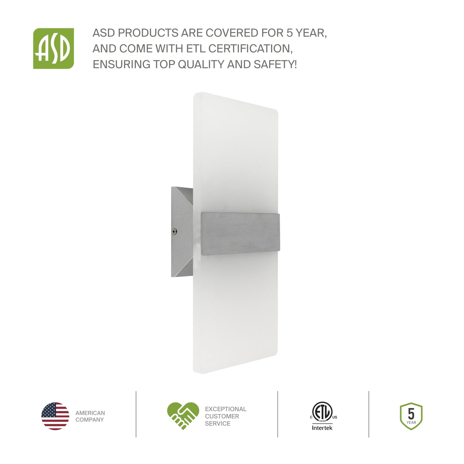 - ADVANTAGES: With a lifespan of 25,000 hours, our fixtures are made to last decades under normal operation! ASD provides a 5-year limited warranty along with ETL certification to guarantee top quality products and safety!