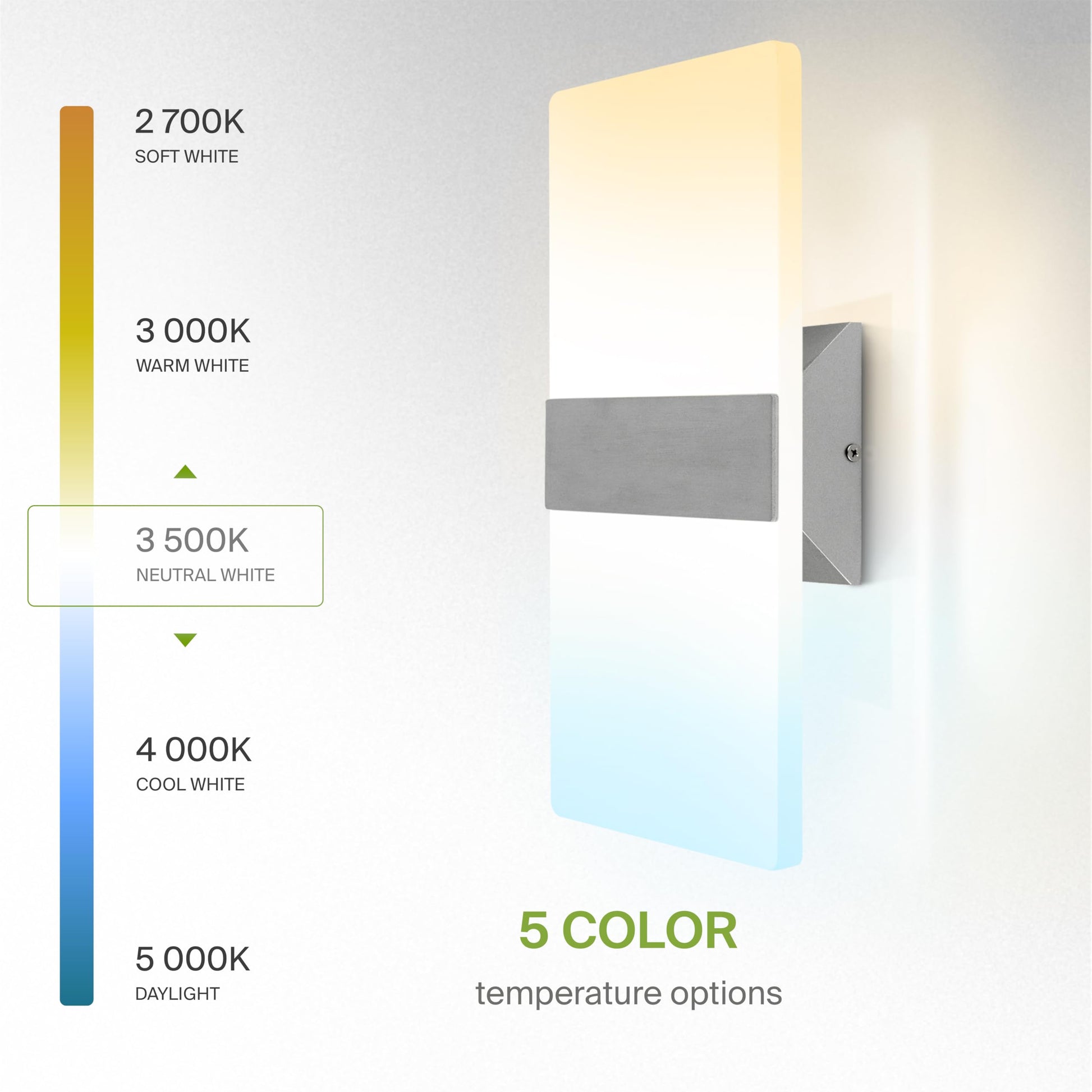 - COLOR SELECTABLE: Choose among 2700K Soft White, 3000K Warm White, 3500K Neutral White, 4000K Cool White, or 5000K Daylight color temperatures with a simple switch. The interior wall light fixture is designed to operate on 120V circuits.