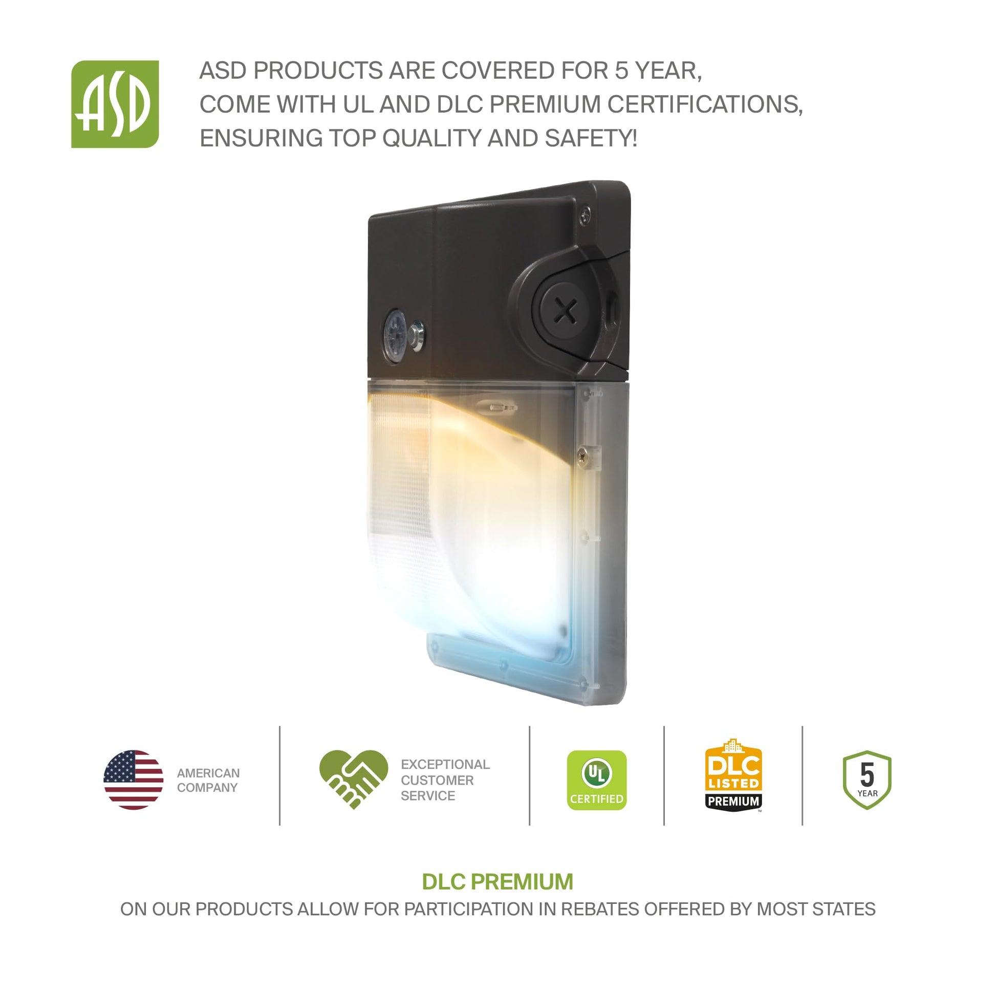 - MODERN DESIGN. ASD emergency security wall pack led exterior light is built with a durable die-cast aluminum housing and anti-glare PC lens for even light distribution. It is Wet Location rated offering reliable performance in any weather. The fixture is designed to operate on 120-277V. Select from 3000K Warm White, 4000K Cool White, and 5000K Daylight White color temperatures and adjust the 20/24/28W power output.