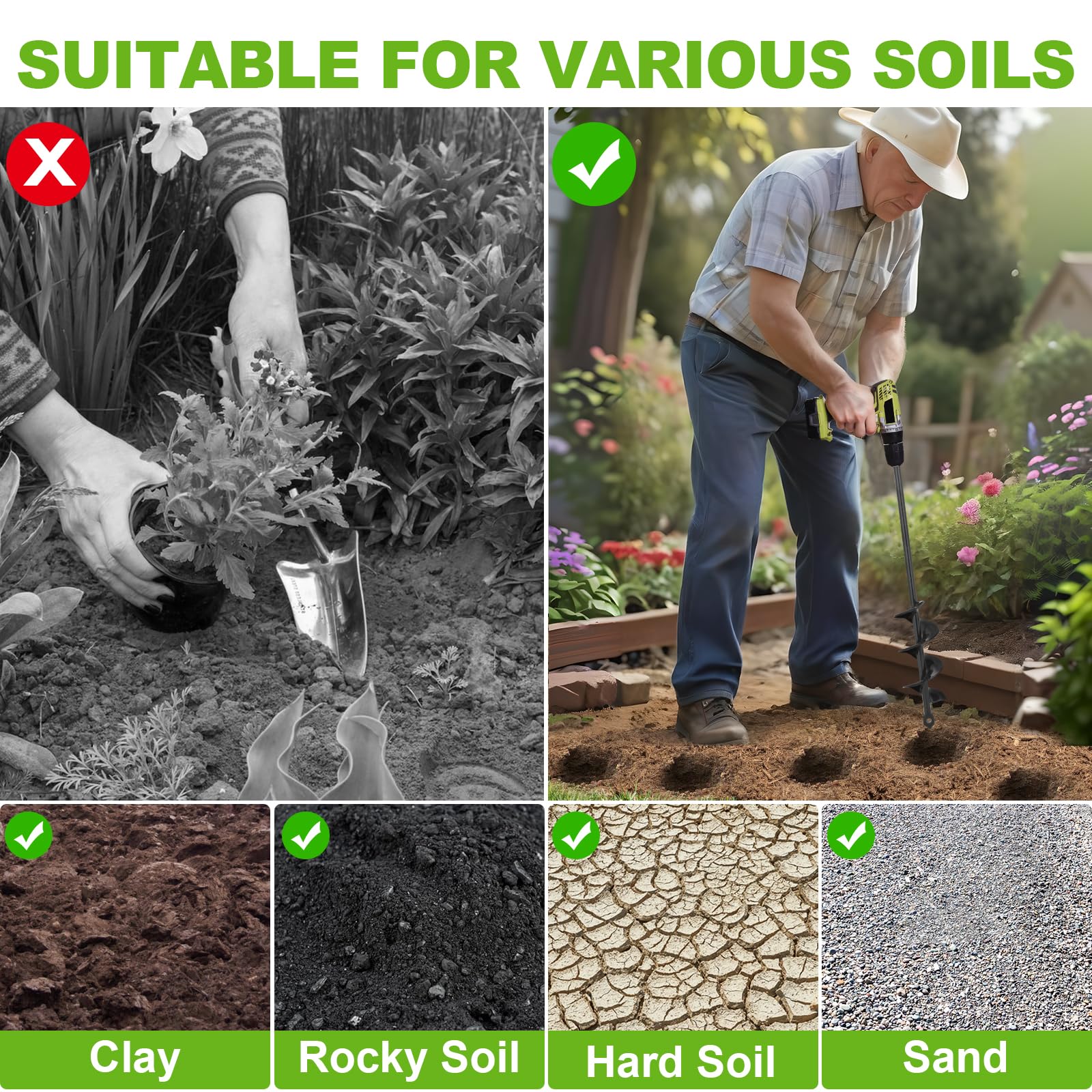 - 【Easy to Use & Warm Reminder】The planting auger for drill fits any 3/8” hex drive drill. 18V or larger drill recommended. Hold with both hands, then turn it on to dig downward. Reverse the drill to pull the soil back up, and you get the perfect posthole. Keep the auger clean from soil or debris and keep dry when not in use.