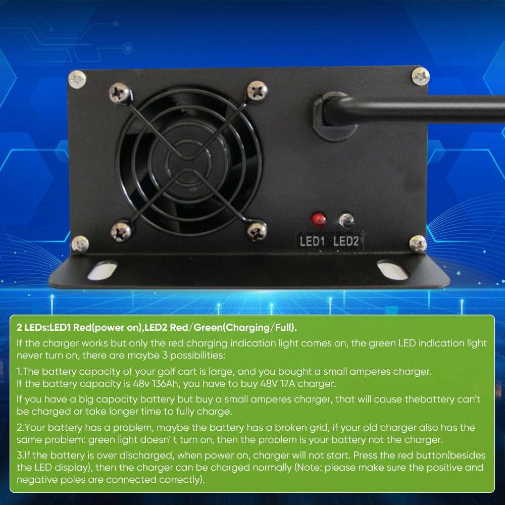 - An automatic charger with trickle mode, will not to overcharge or undercharge your golf cart battery.
