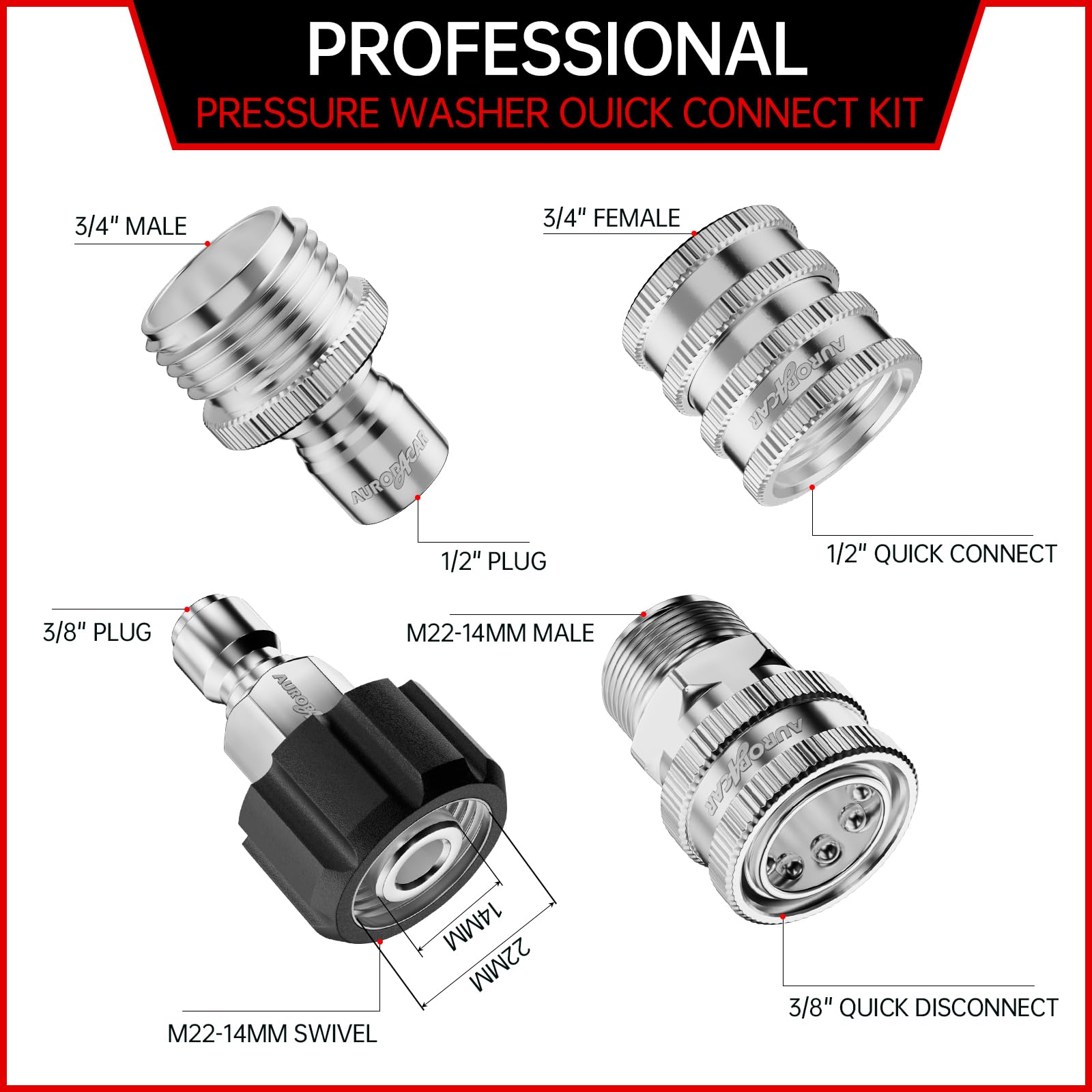 - Package Includes: Including 2 units of 3/8" quick disconnect, 2 of 3/4" female + 1/2" quick connect, 2 of M22-14 swivel + 3/8" plug, and 2 of 1/2" plug + 3/4" male. Experience the convenience of pressure washer quick connects with our comprehensive kit