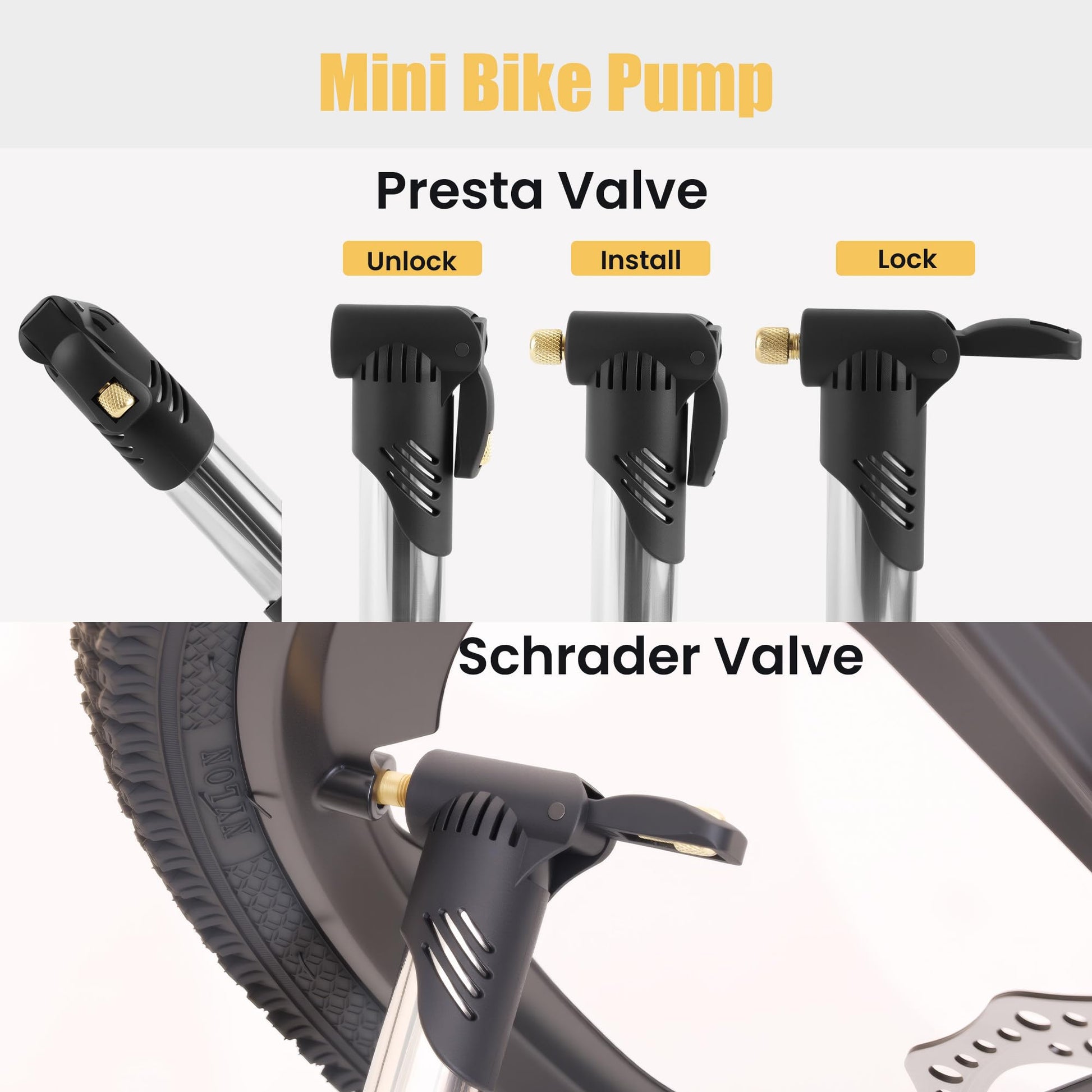 - Portable Mini Bike Pump: Mini bike pump features two valve types (Schrader and Presta); its lightweight yet durable aluminum body ensures fast, leak-free inflation of bikes, sports balls, and inflatable rings