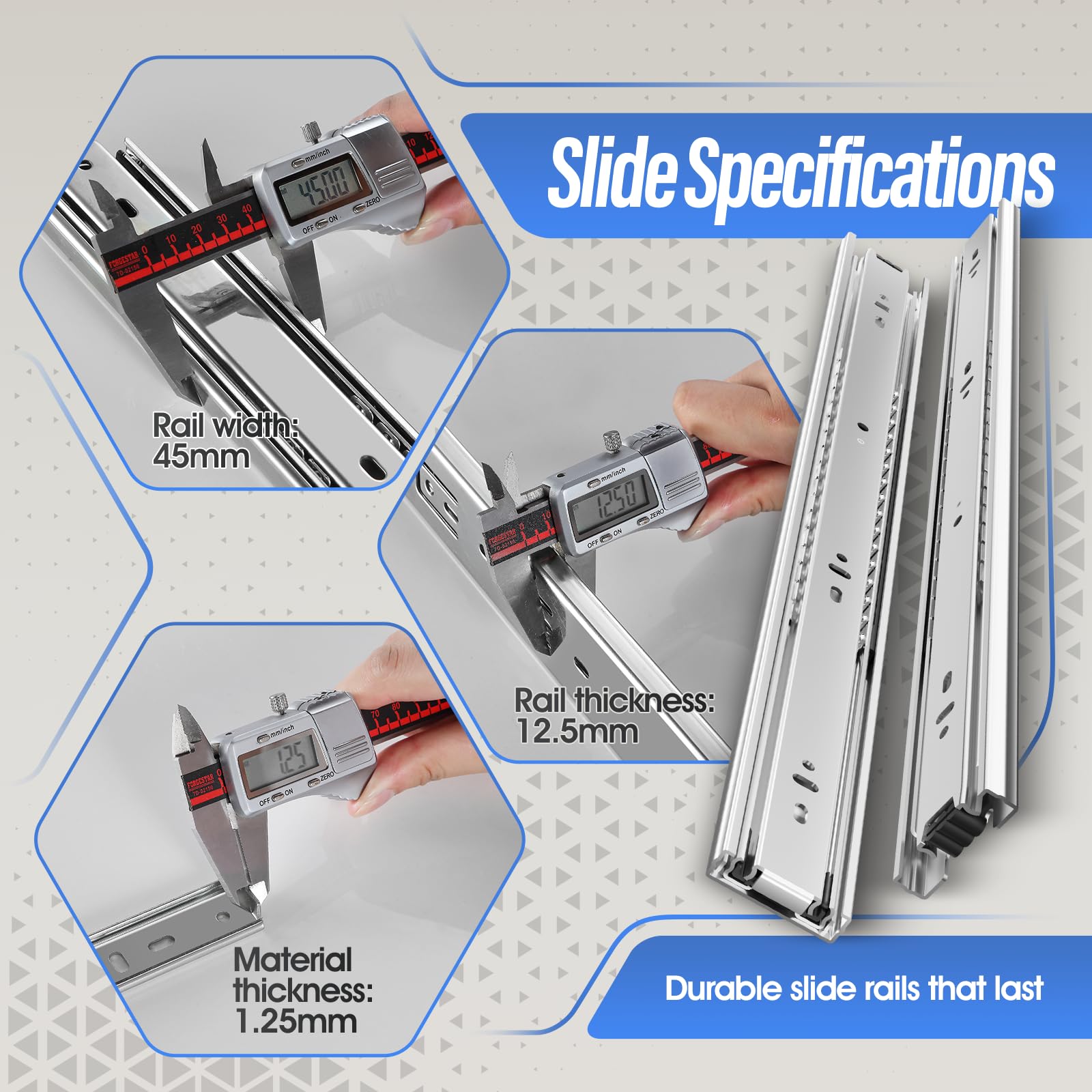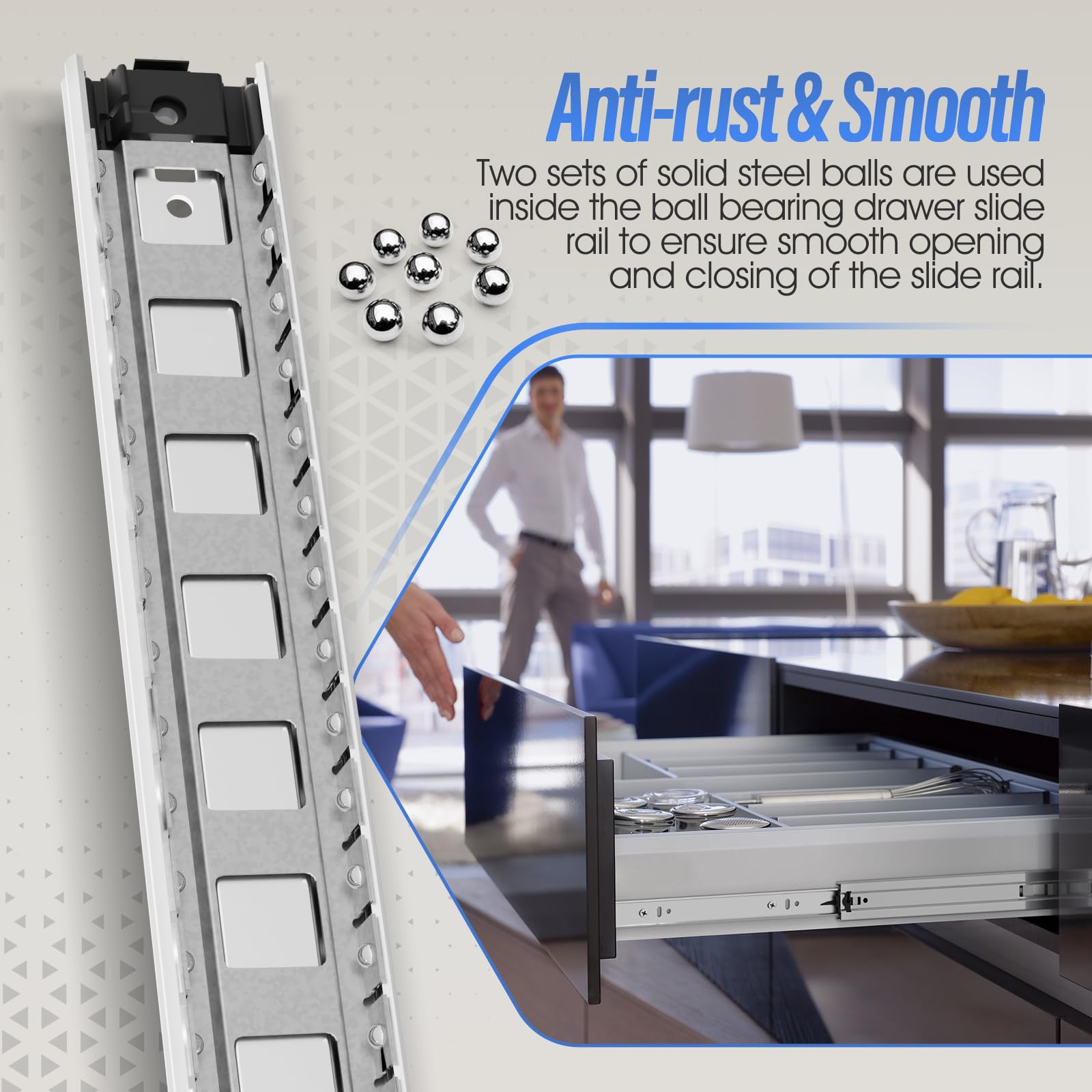 - 【Anti-rust & Smooth 】The anti-rust ability and oxidation resistance of our slides is superior to the others because of the special electrophoretic coating surface treatment. With dual industrial grade bearing ball inside, the drawers slide smoothly even though carrying heavy items. With a rubber crash pad on, which is a wear-resisting and impact-resistant device, the drawers slide quietly without collision noise.