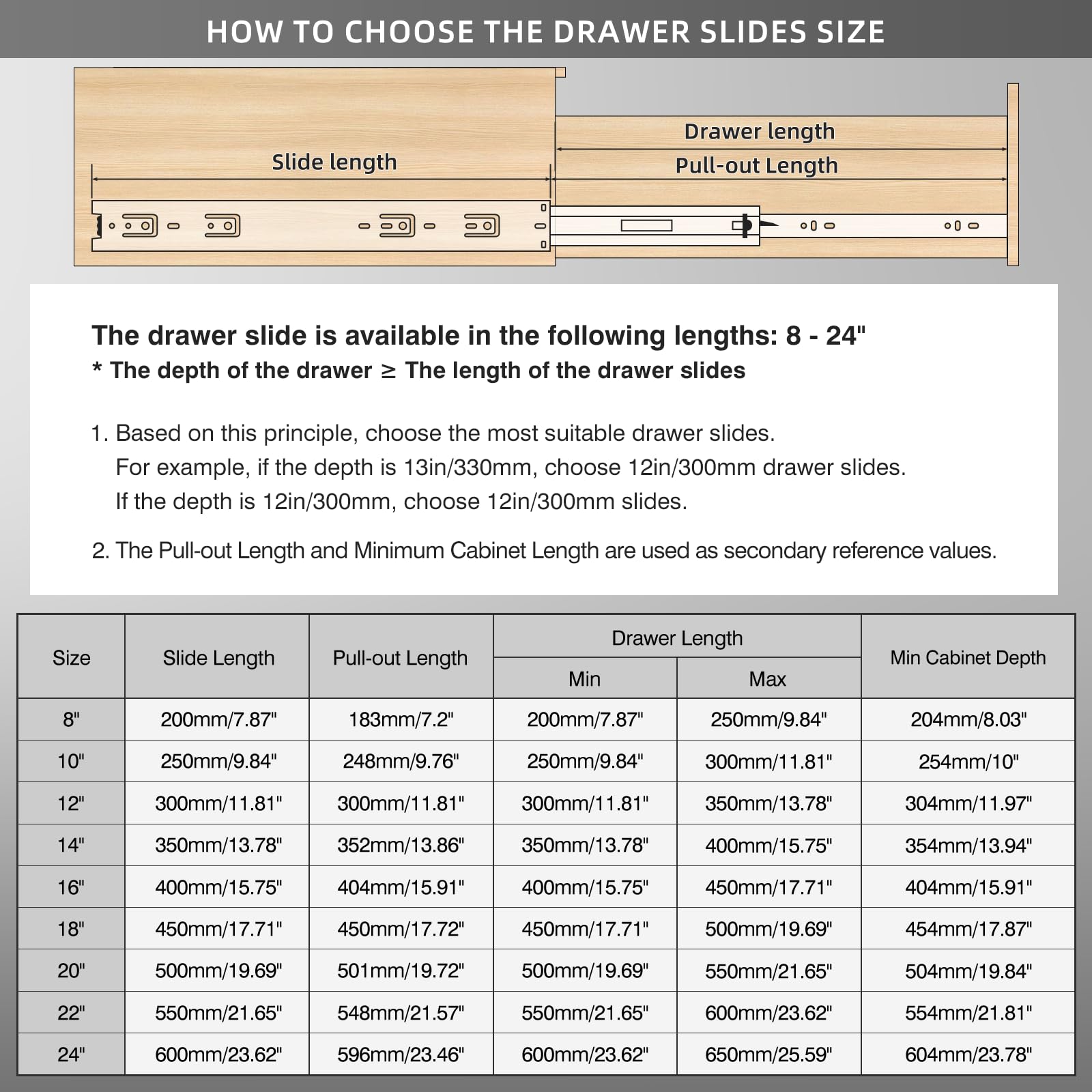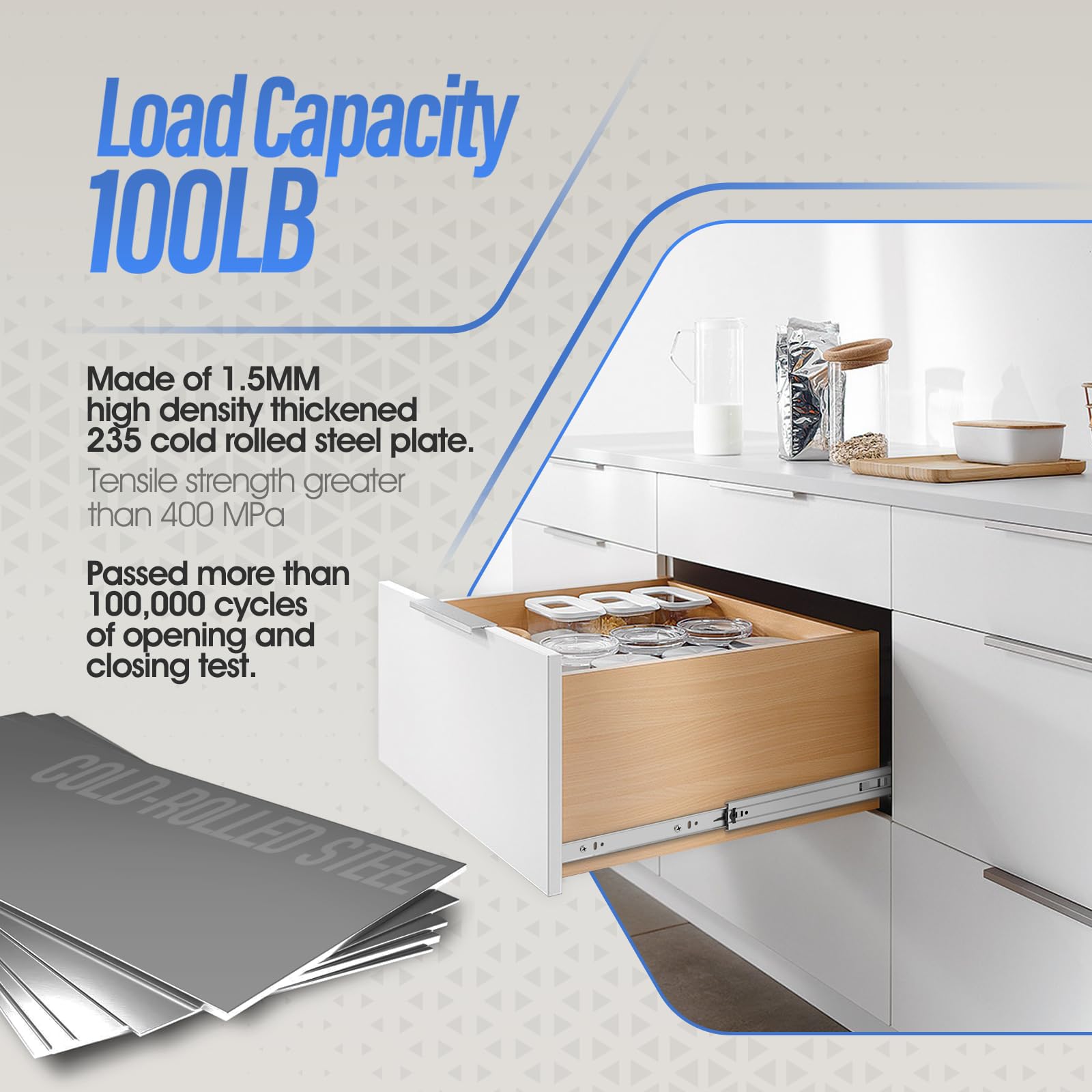 - 【Double Load Bearing】 Baidice drawer slides are made of 1.2mm high-quality cold-rolled steel, and the material is one times the thickness of ordinary slides. Full extension drawer slides hold 100 pounds, 40 pounds more than regular slides.