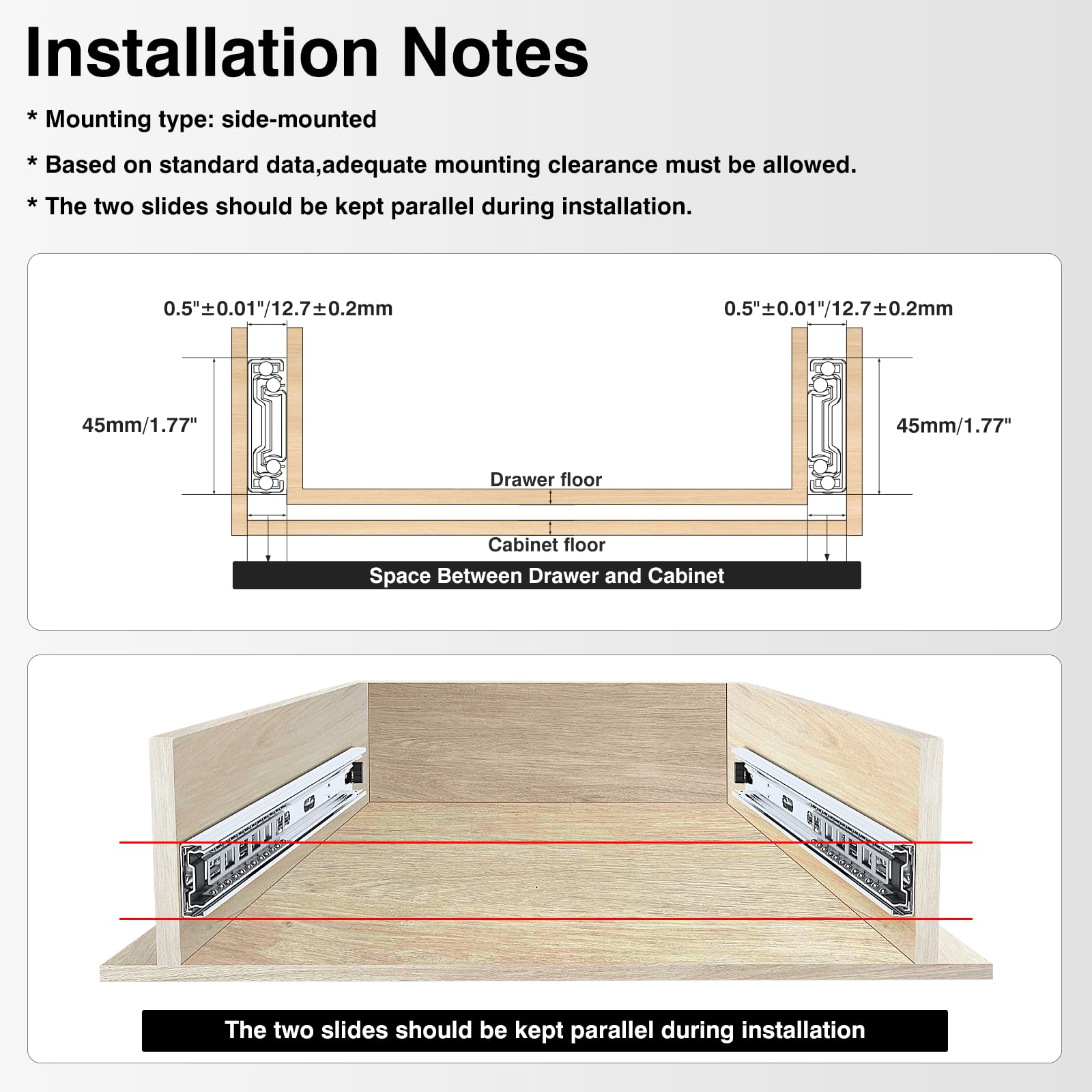 - 【Installation Note】Color:Sliver; Qty: 10 pairs. Length: 21.65"(550mm), full extension lengths: 43.23"(1098mm). Left side mount clearance: 0.5" (12.6mm), right side mount clearance: 0.5" (12.6mm). Please push the inner ball bearing to the top of the slide first, and then install it to the slide. There are 9 screws in the card box of the product. We provide a detailed installation video in the listing.