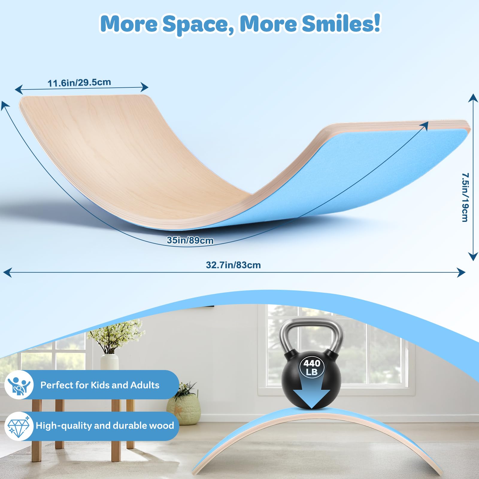 - 【Spacious & Stable】Made from high-density hardwood, this balance board measures 35" long and 11.6" wide, supporting up to 440 lbs. Durable construction guarantees reliable performance for users of all
