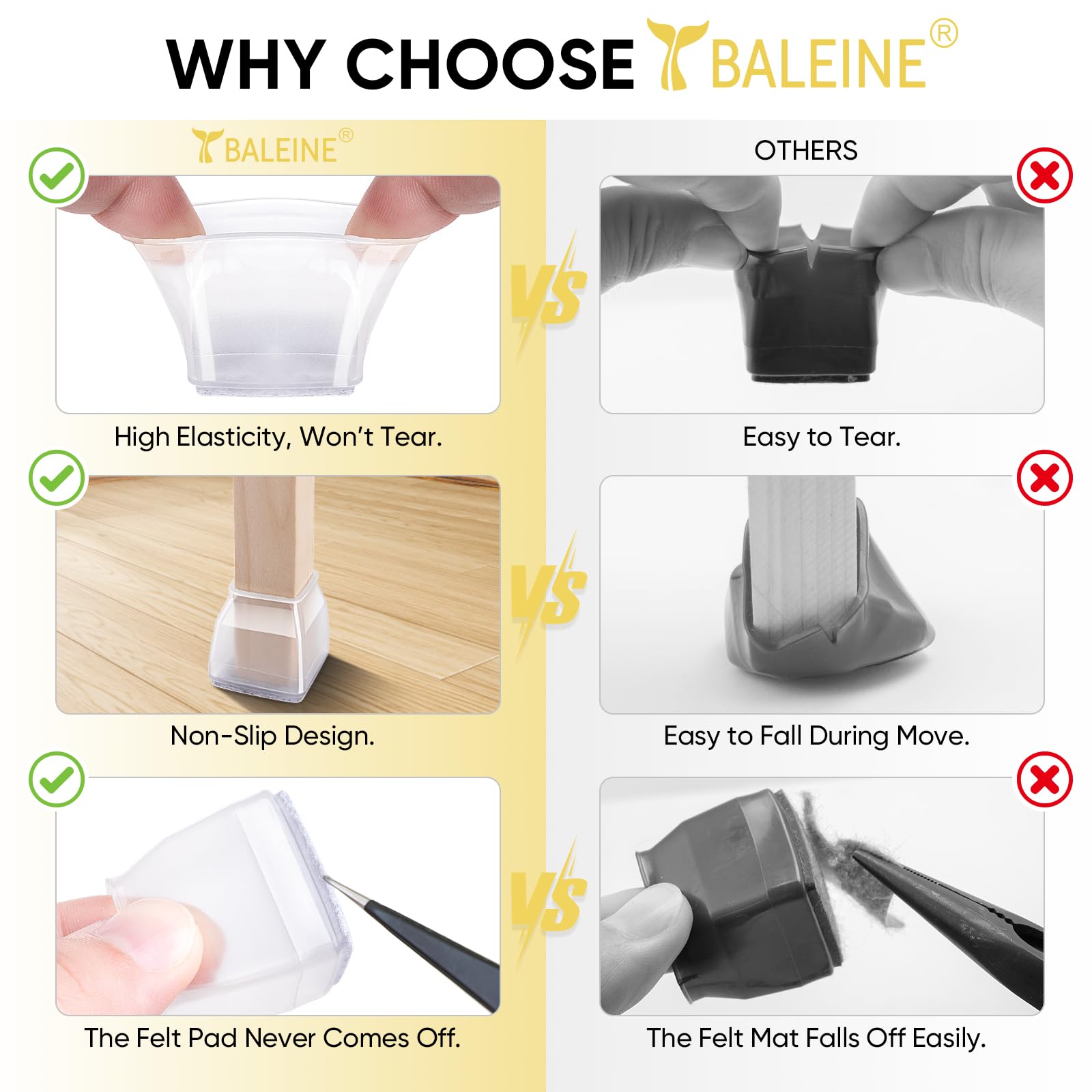 - [BALEINE DIFFERENCE] We'd like to offer top-tier quality products at the most reasonable price. So we chose the premium quality silicone material. It bonds the felt pad better, and won't tear easily when stretched or have any unpleasant odor. All caps are well-packed during shipping so you won't receive pressed chair leg covers which might shorten the life span of it.