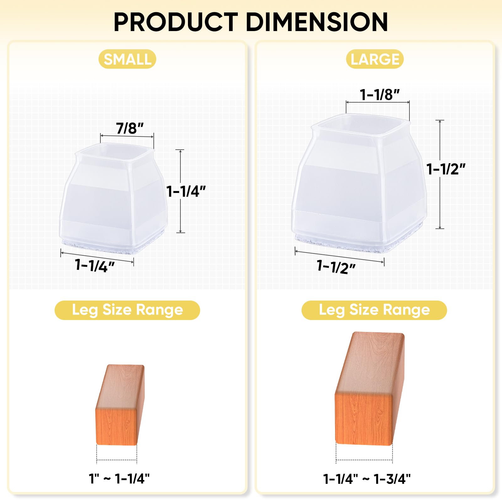 - [EASY TO USE] Unlike traditional felt chair leg floor protectors with glue or nail, our chair leg protector will last much longer and can adapt to different shapes of chair legs. The Square-Small sized cap will work for 1" ~ 1-1/4" square chair leg. The Square-Large sized cap will work for 1-1/4" ~ 1-3/4" square chair leg.