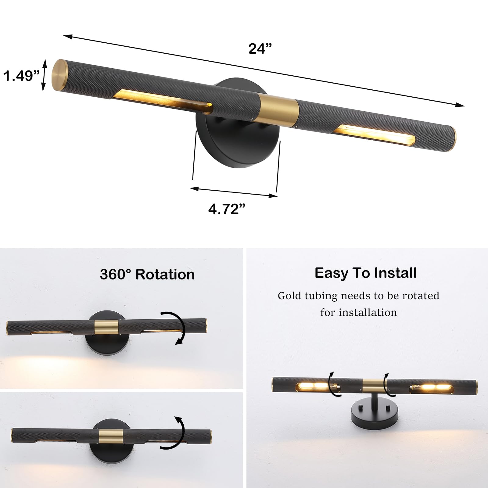 BAODEN Modern Picture Light 24 inches Brushed Brass Gold Black Wall Sconce with Knurled Texture Cylinder Metal Shades Rotatable 360°Indoor Wall Lighting Fixture for Bathroom Vanity Lights Bedroom