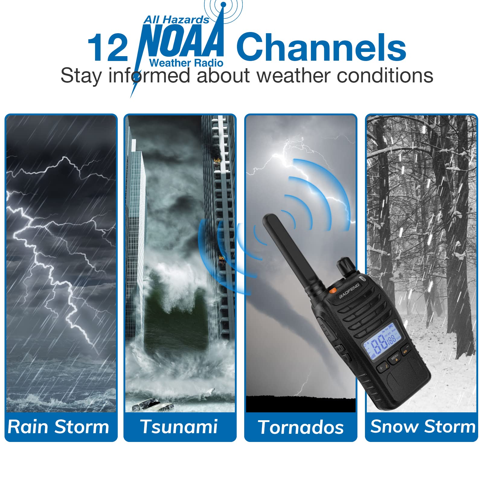 - NOAA Weather Scan & Alert: NOAA weather scan will automatically scan through 12 available weather band channels of the walkie talkies, then locks onto the strongest weather channel to alert you to extreme weather.
