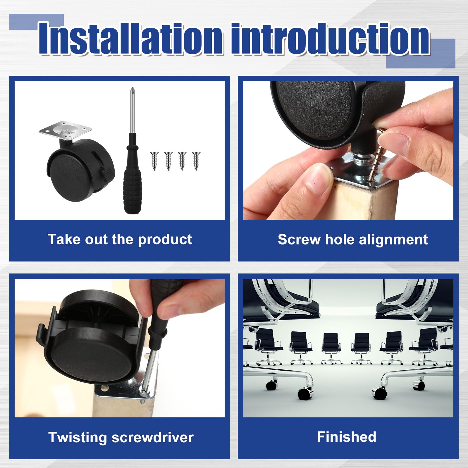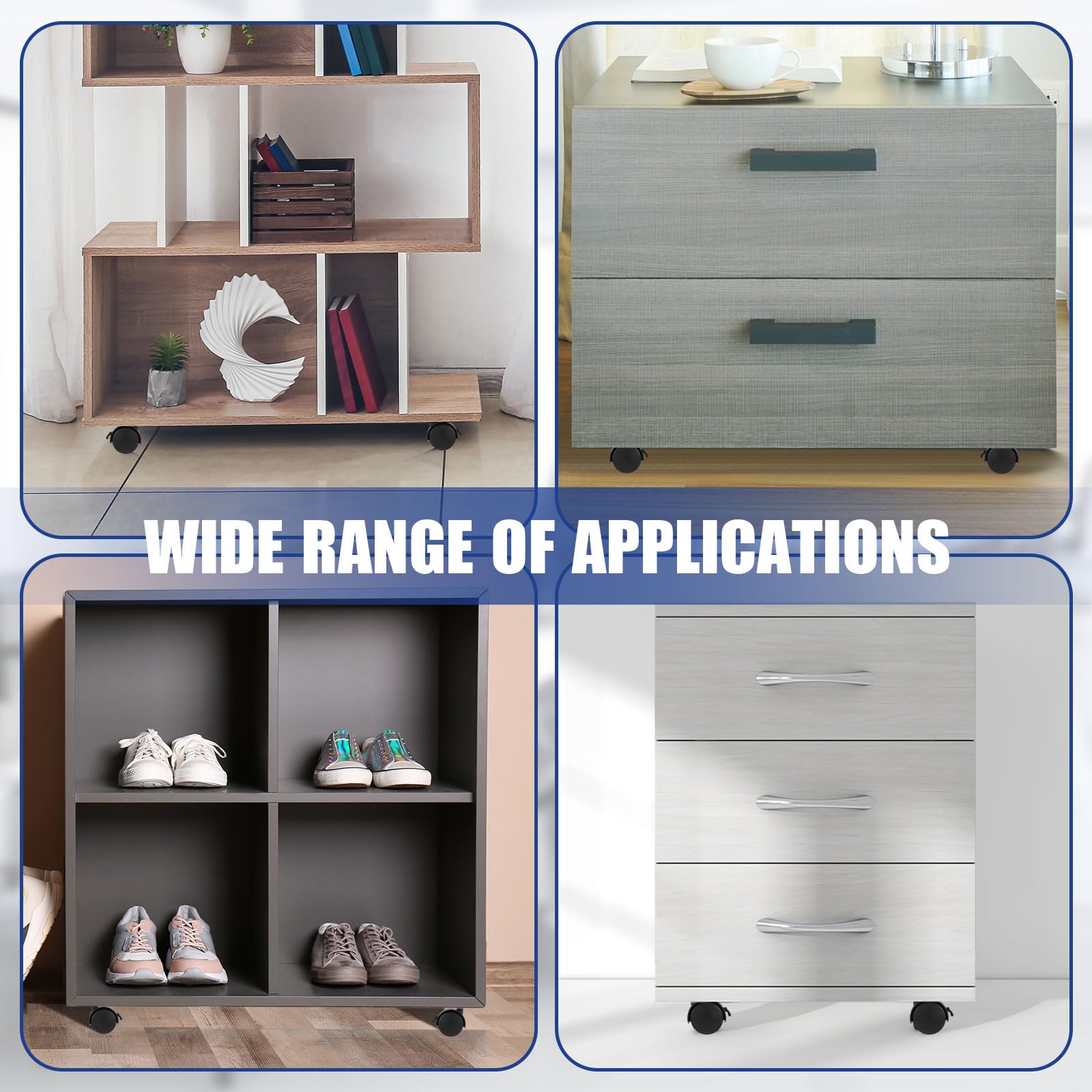 - Versatile Applications: perfectly fitting a variety of furniture types in multiple settings, such as home, office or industrial; These replacement caster wheels transform static heavy furniture into movable, functional and stylish pieces; Generally fixed with screws below the bottom of wooden furniture, such as drawers, side tables, shelves, planting trays, workbenches, etc.; In addition, the locking brake design helps each caster to support the furniture stably