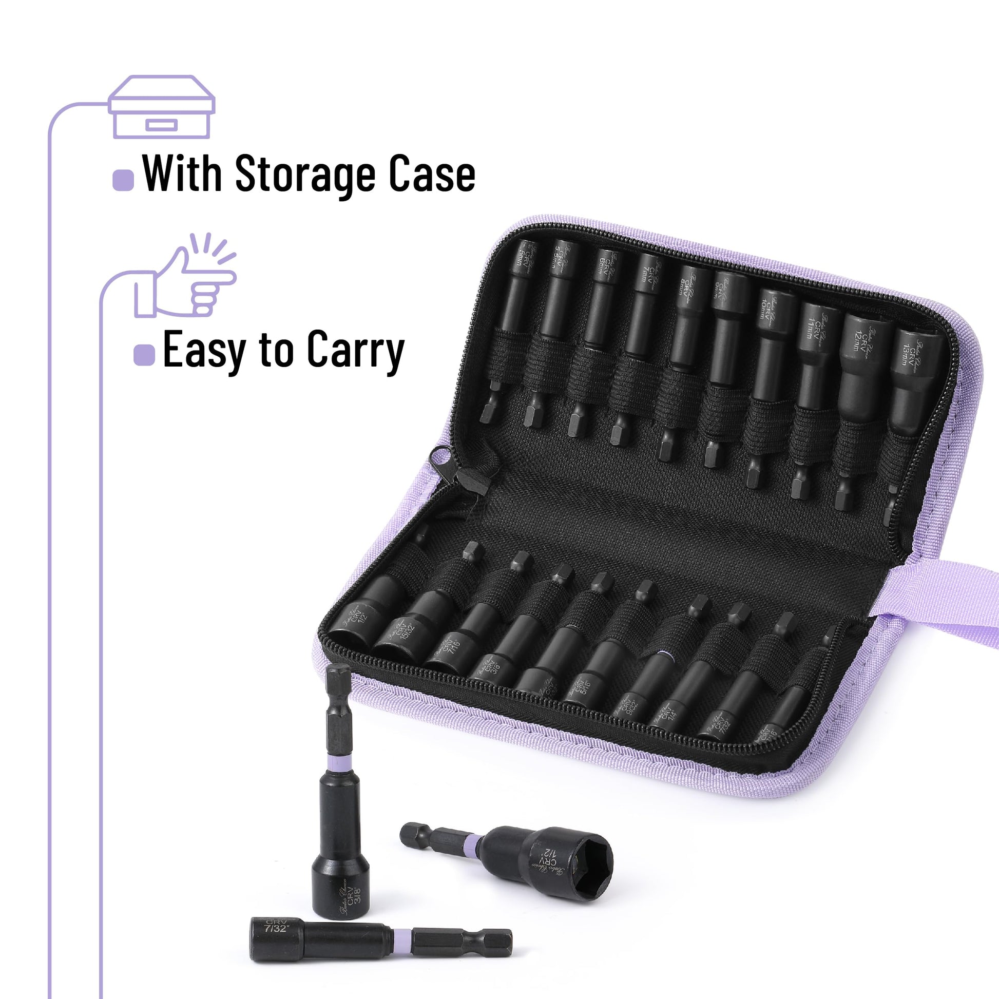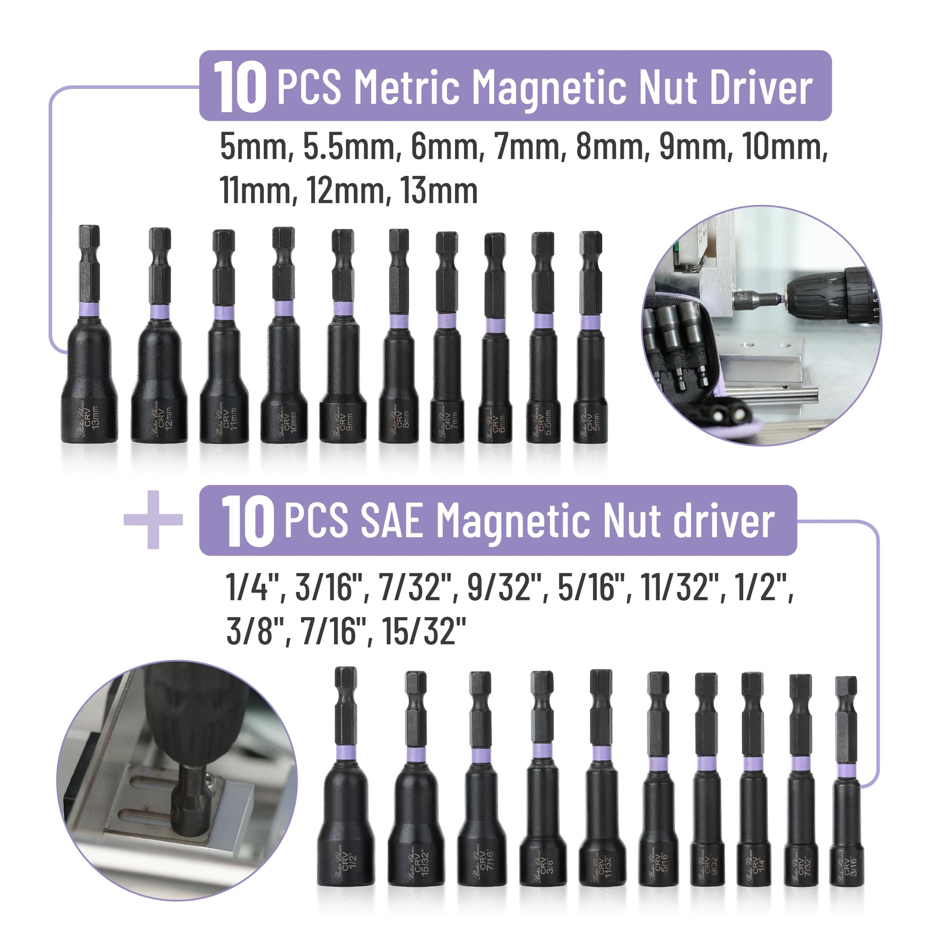 - The set includes sizes ranging from 5mm to 13mm and 3/16" to 1/2", all compatible with a 1/4" driver, offering flexibility for various applications.