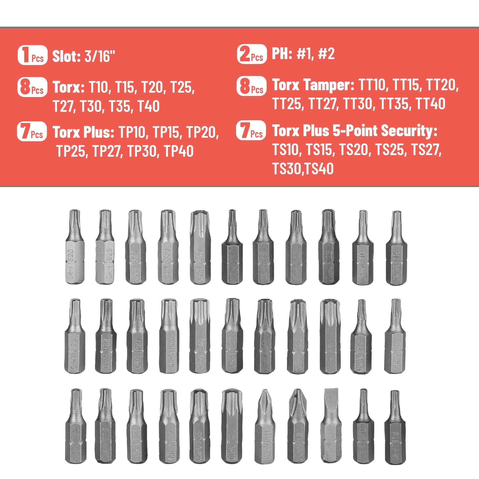 Details: Bates mini ratchet set includes 34 pieces, offering a combination of Torx Plus and Torx bits, providing you with a versatile selection of fasteners for different applications. Constructed from durable Cr-V steel, the bits and small ratchet wrench are built to last and provide superior strength for your repair and DIY projects. The compact 1/4-inch drive ratchet wrench is designed to fit into tight spaces, making it ideal for precision work and maneuvering in confined areas. This set is perfect for use with Torx Plus and traditional Torx fasteners, offering flexibility for a wide range of tasks. All items come neatly packed in a red storage box, keeping your tools organized and easily accessible for whenever you need them.