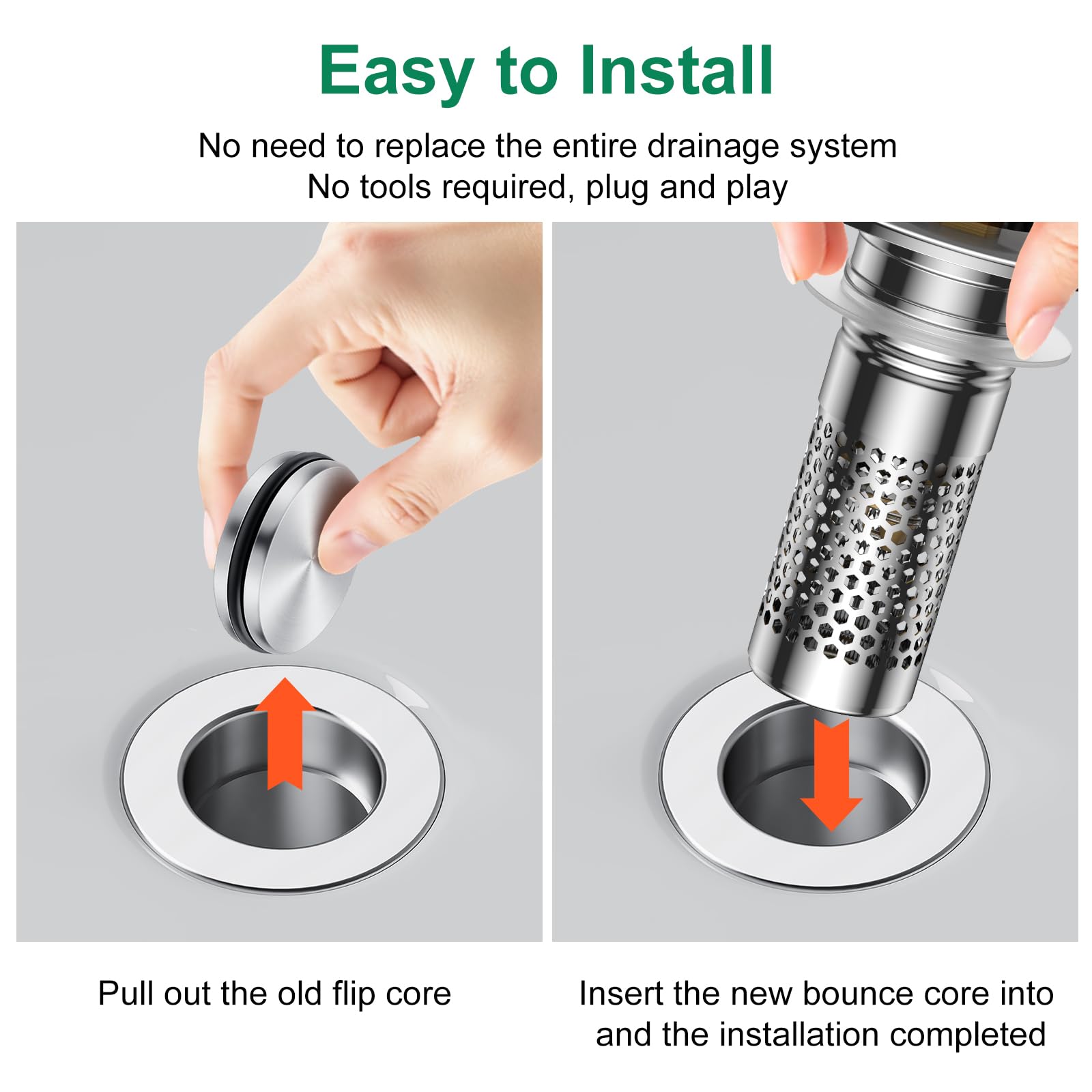- 【Built-In Hair Catcher Prevents Clogs】Featuring an integrated hair catcher, this pop-up sink stopper effectively traps hair and debris before they enter your pipes. Sink drain strainer provides a reliable anti-clog drain filter solution to keep your sink flowing smoothly without frequent maintenance.