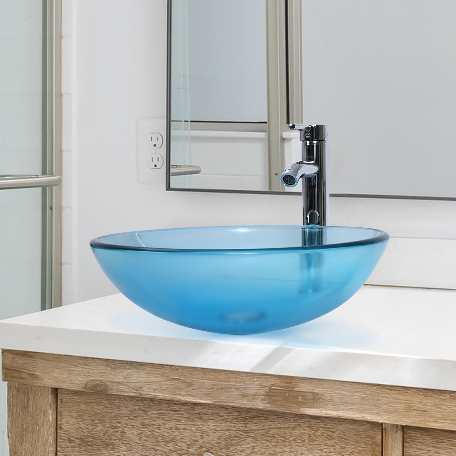 Bathroom Vessel Sink, Tempered Glass Vanity Round Bowl with Chrome Faucet and Pop up drain Set, Blue