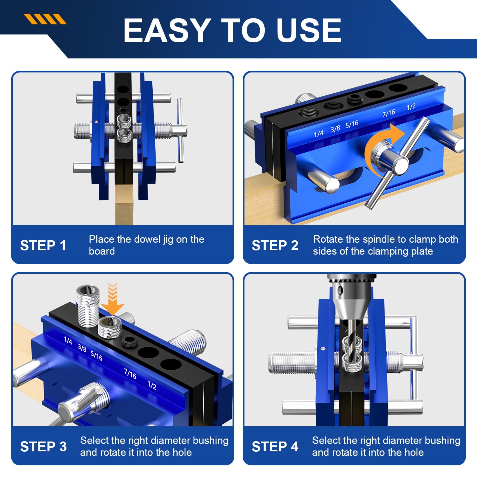 - PACKAGE INCLUDES: You will get a professional self centering dowel jig, 6 rust-resistant steel bushings (2x 1/4”, 2x 3/8”, 2x 5/16”), an instruction manual