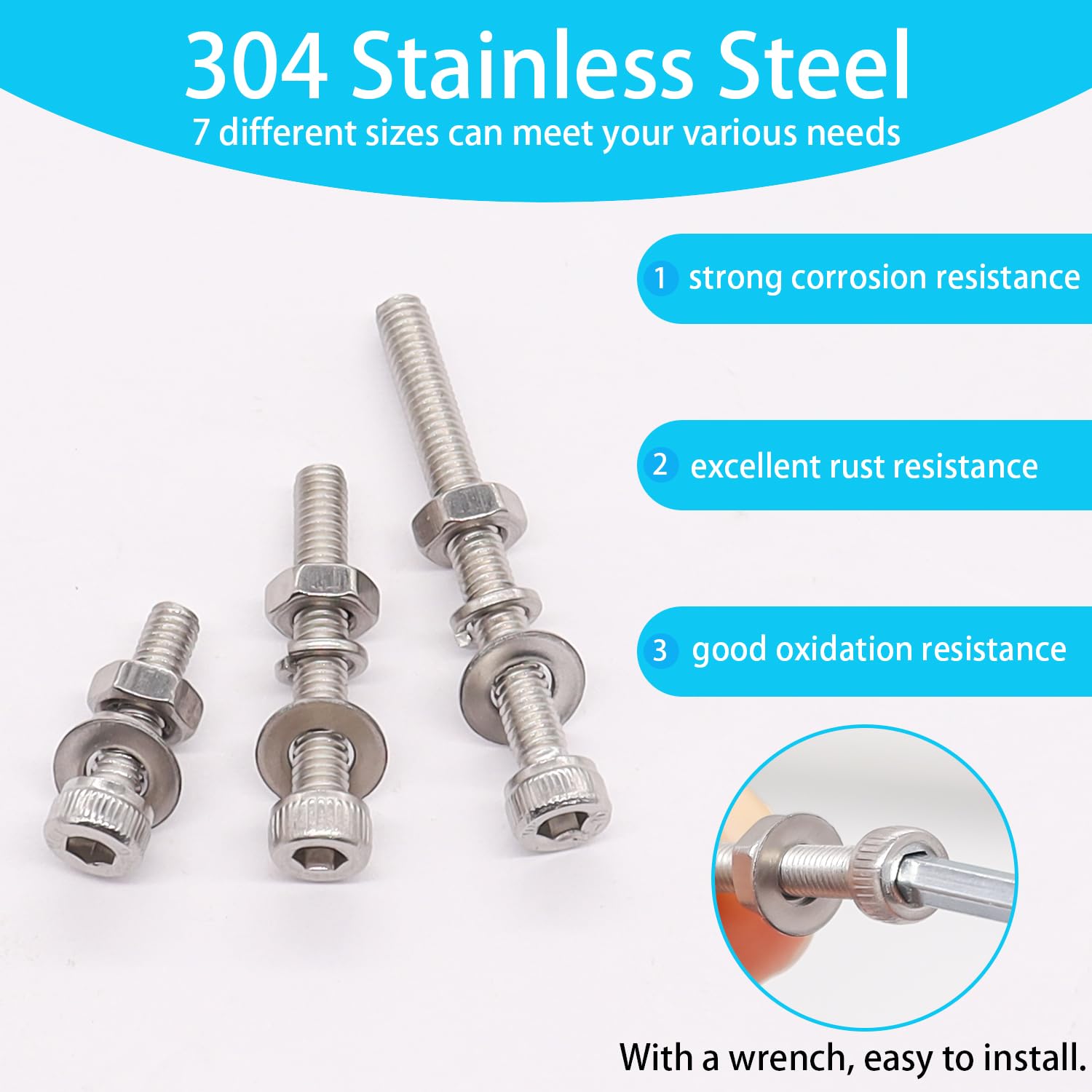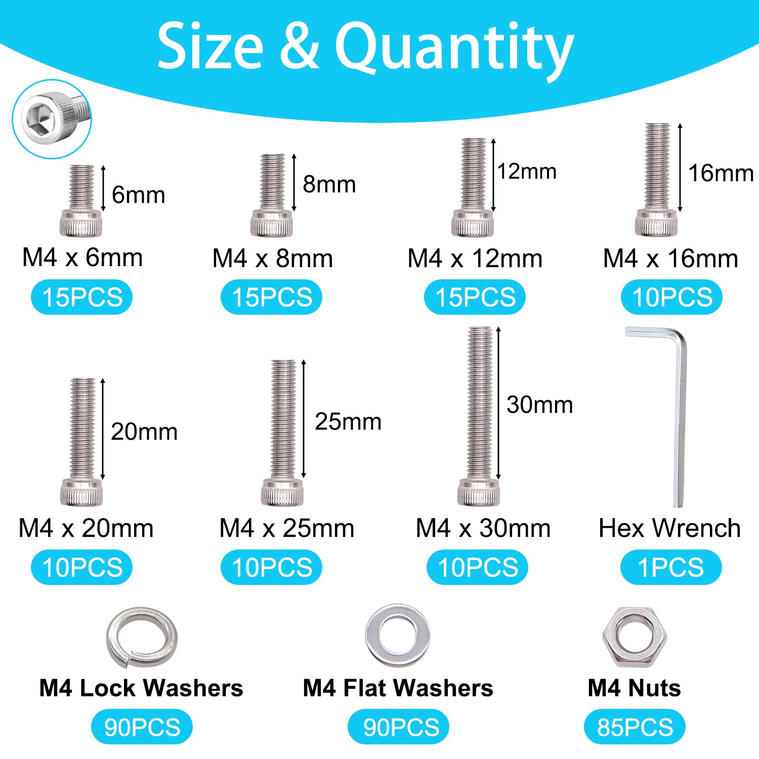 - Product include: Our M4 screws bolts kit comes in 7 different sizes, M4 x 6/8/12/16/20/25/30mm, total 350pcs(85pcs Screws, 85pcs nuts, 90pcs lock washers, 90pcs flat washers)with a hex wrench.