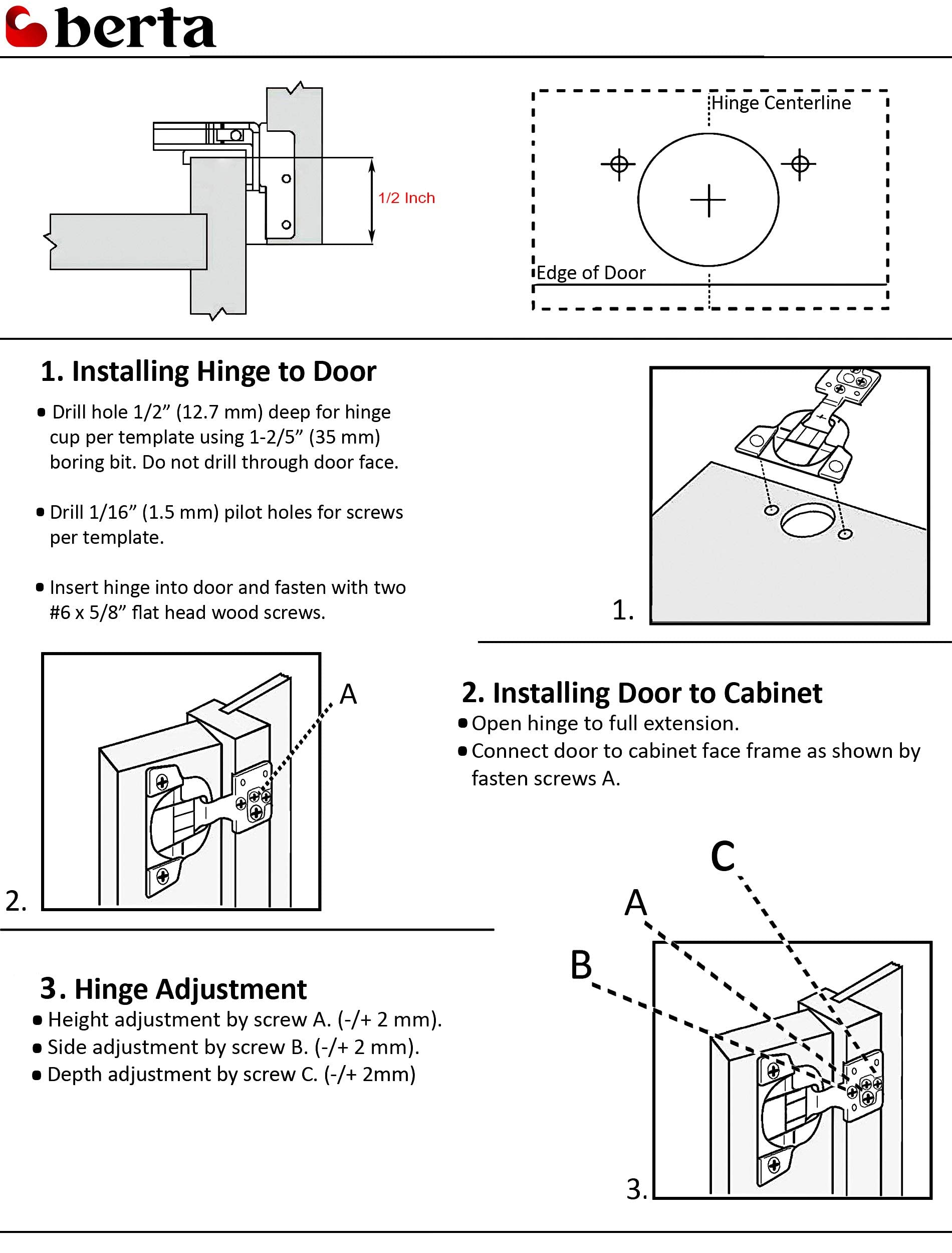 - 3-Cam Adjustment: Easiest to install and can be easily adjusted with the turn of a screwdriver. Depth, Side and Height adjustment functions will make sure that your new custom-made cabinet doors don't sag, align correctly.