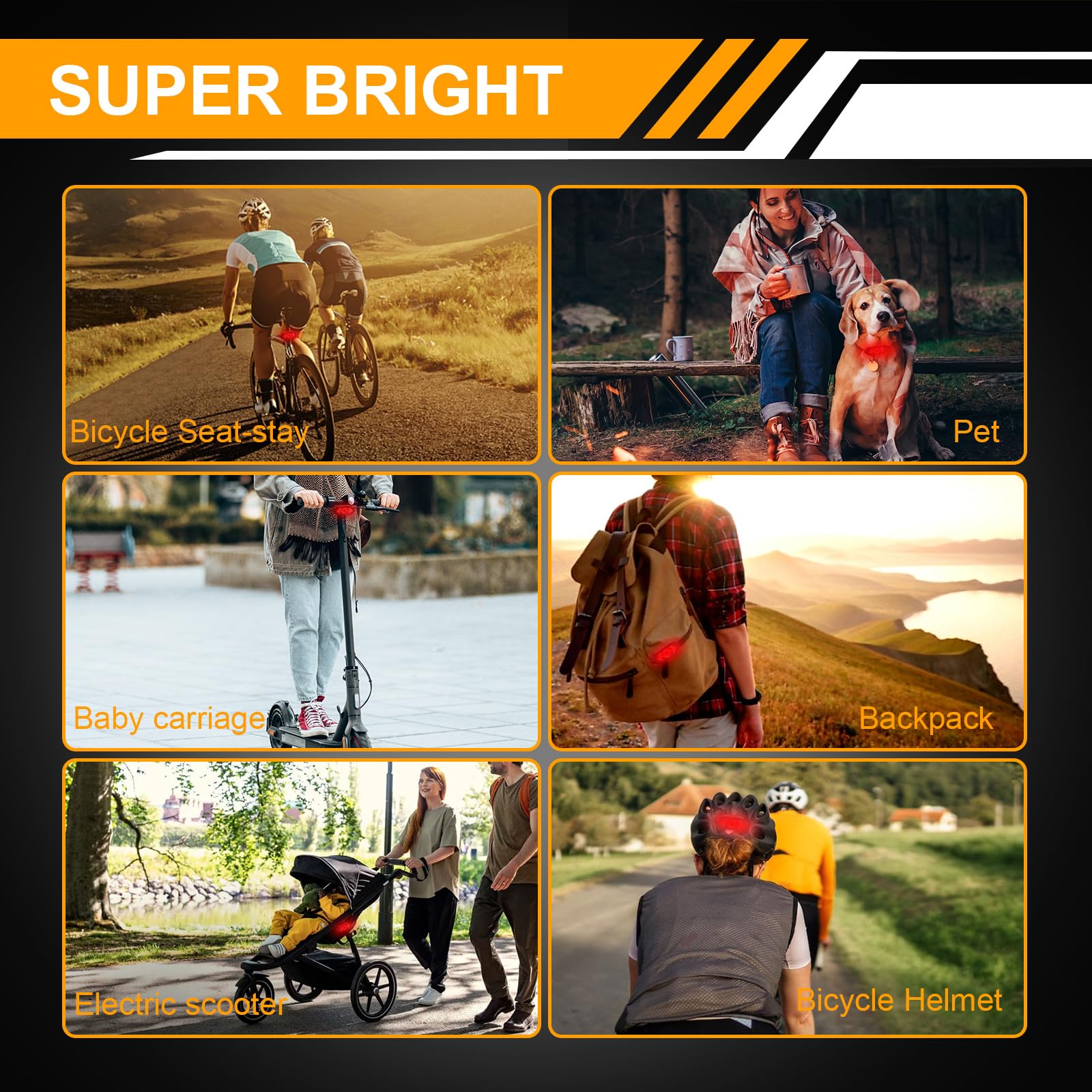 - 【EASY TO INSTALL & USE】- The rechargeable bicycle lights installs quickly without tools, the silicone mount strap for Taillight is designed with openings that can tightly fit around most size handlebars and seat posts. Also the size for bike back light is portable, can install on your bicycle, helmet, pets, backpack or anywhere you can imagine. Strengthened the safety for night riding.