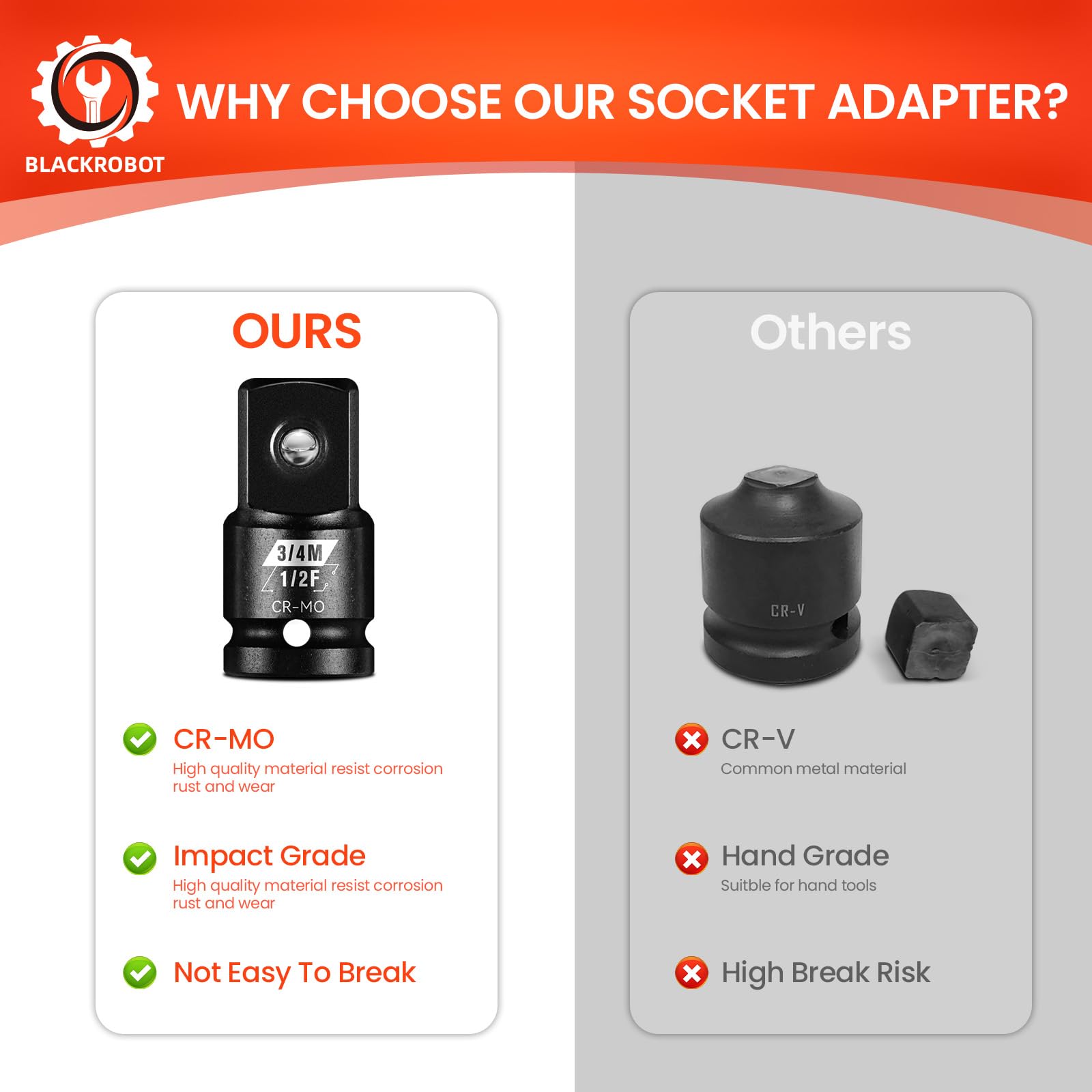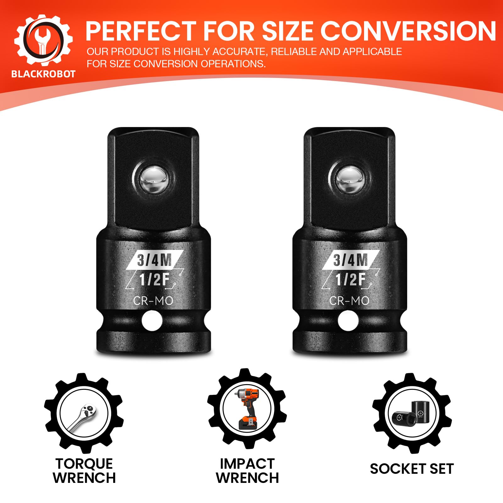 BLACKROBOT 2 Pieces 1/2” F To 3/4” M Impact Socket Adapter Set, SAE Drive Cr-Mo Steel Exceeds ANSI Standards, Square Drive Socket Reducer for Impact Driver Wrench