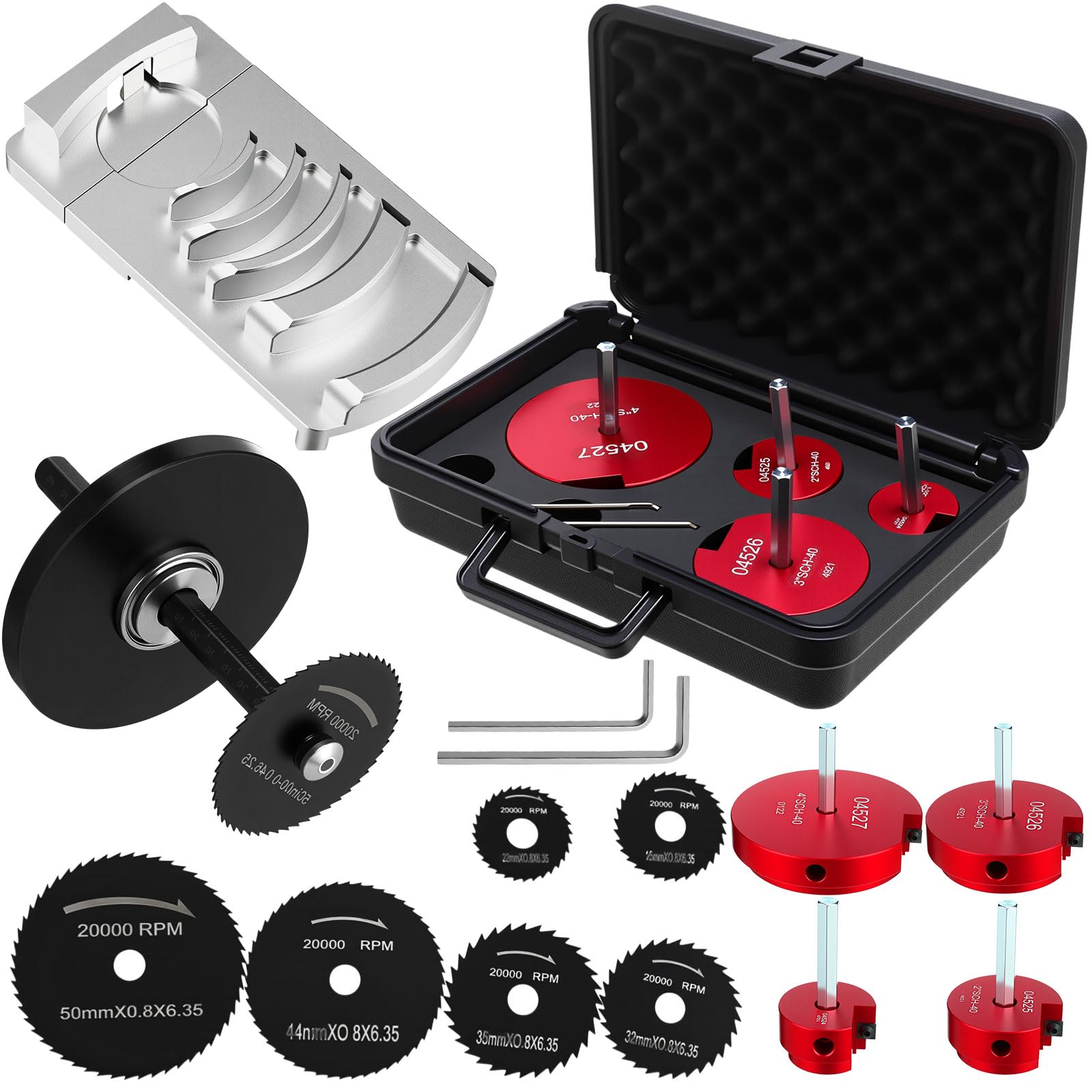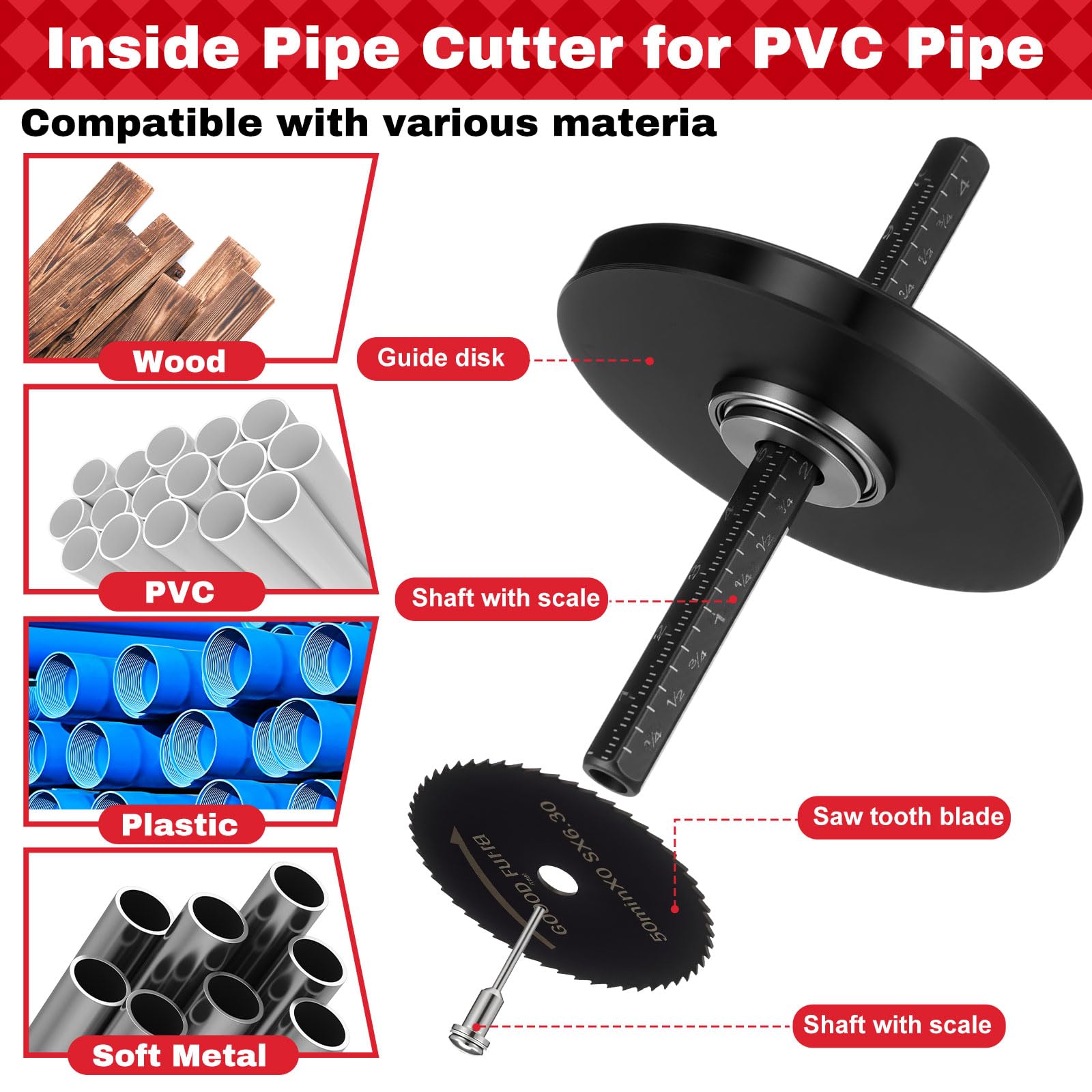 - Inside Pipe Cutter for PVC Pipe: the PVC Pipe Cutter comes with 6 saw blades (22mm, 25mm, 32mm, 35mm, 44mm, 50mm) and a 3" guide disc for a wide range of pipe diameters, as well as an integrated hexagonal spanner shaft and measuring scale for precise positioning and cutting; Built with a hardened stainless steel shaft and HSS saw blade, the Pipe Cutter is sharp and durable enough to cut PVC, ABS and soft metals with ease