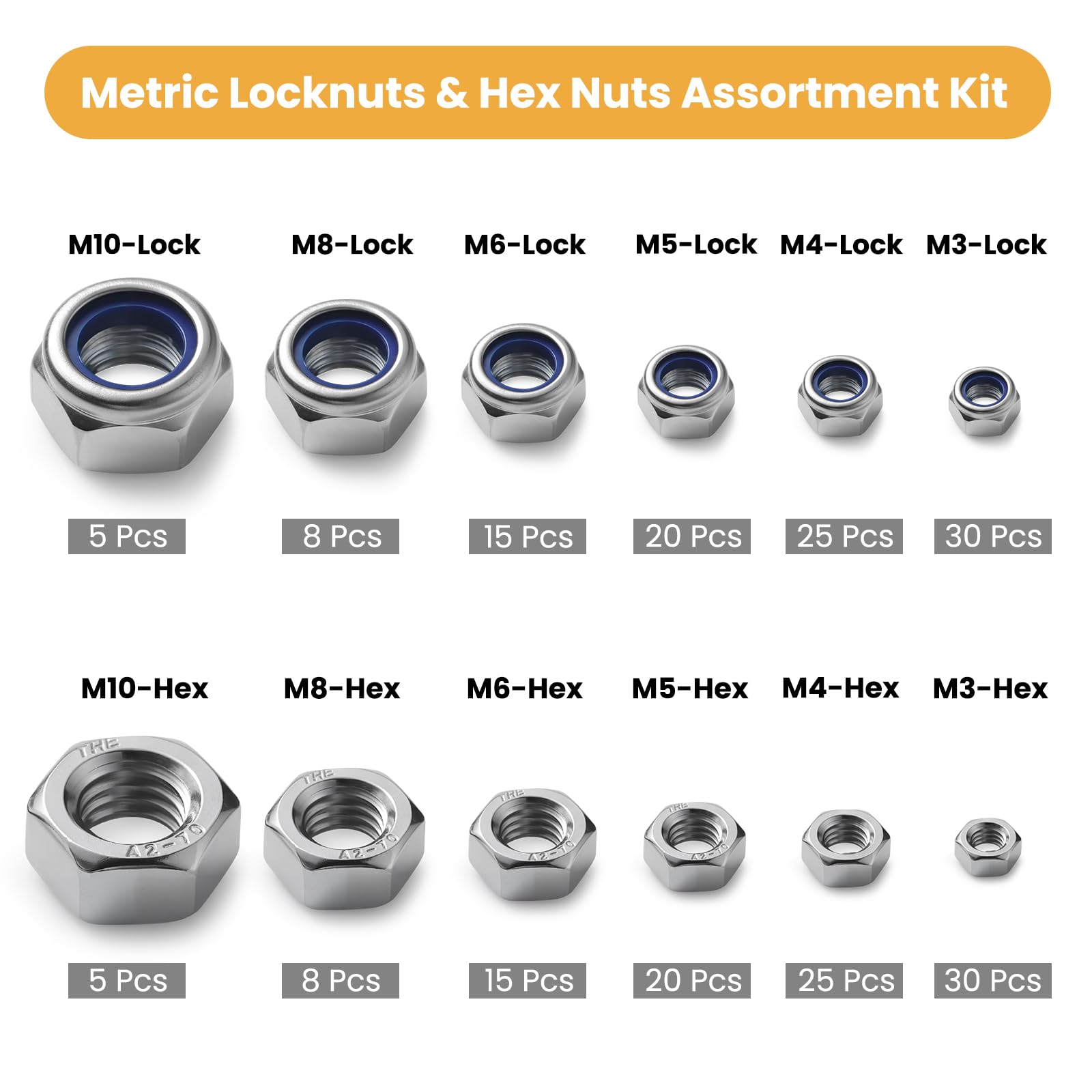 - Handy Locknuts & Hex Nuts Assortment Kit: Includes M3-Lock(30PCS), M4-Lock(25PCS), M5-Lock(20PCS), M6-Lock(15PCS), M8-Lock(8PCS), M10-Lock(5PCS), M3-Hex(30PCS), M4-Hex(25PCS), M5-Hex(20PCS), M6-Hex(15PCS), M8-Hex(8PCS), M10-Hex(5PCS). 6 sizes lock nuts and hex nuts kit to meet your various needs