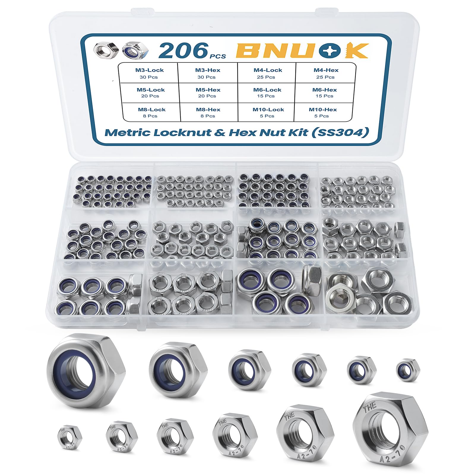 BNUOK 206PCS Metric Locknuts and Hex Nuts Assortment Kit, M3 M4 M5 M6 M8 M10 Nylon Insert Lock Nuts Set, 304 Stainless Steel Hex Nut Nylock Nut