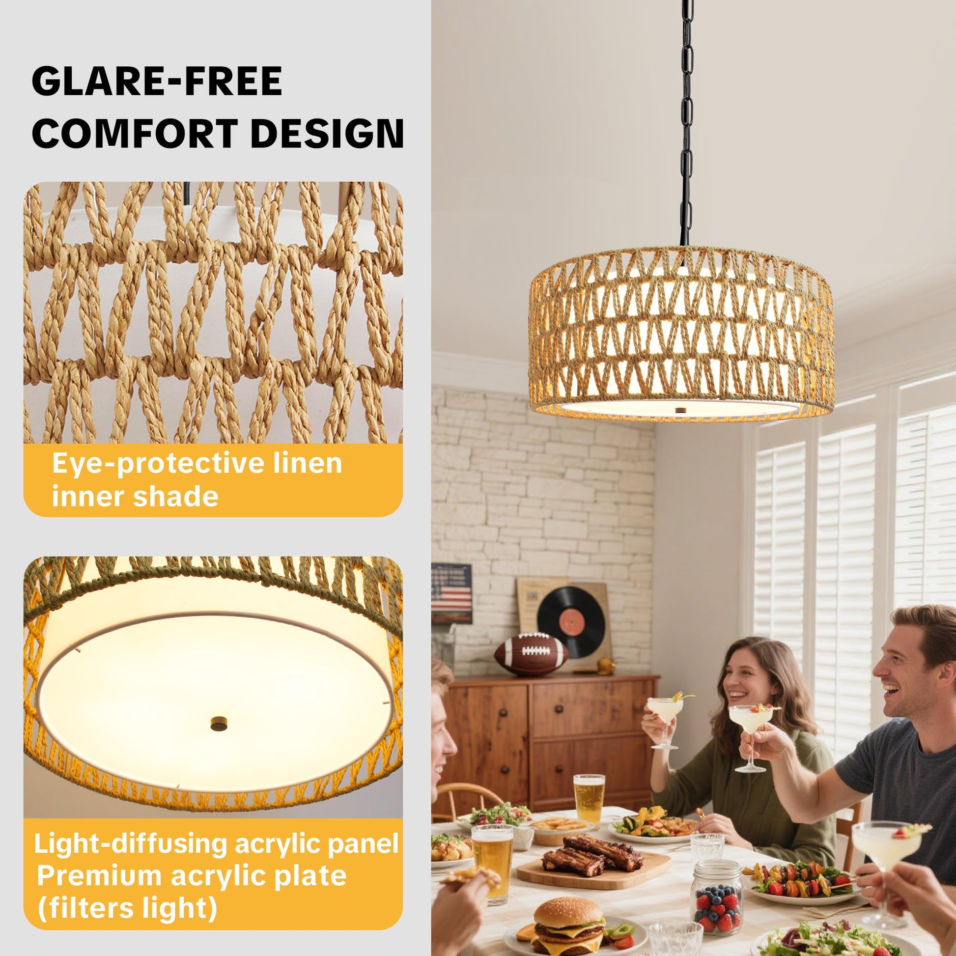 - 【Handwoven Natural Materials】Crafted from handwoven natural rattan with a fabric lampshade, this rattan chandelier blends rustic charm with modern elegance. The lampshade’s two-tier design, combining rattan and fabric, enhances the light’s softness and deepens the boho ambiance—directly boosting your mood and bringing more warmth to your life.