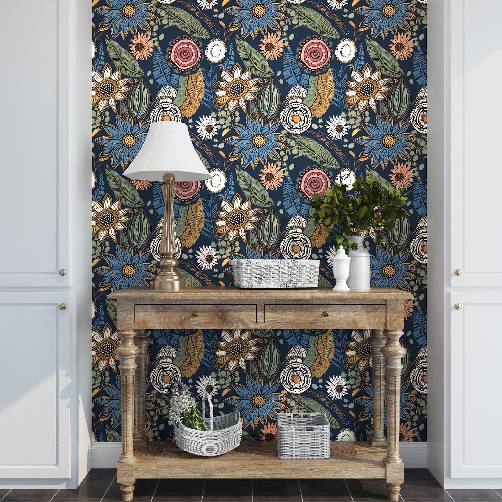 Boho Wallpaper Peel and Stick,Vintage Floral Contact Paper 17.5" x 118", Retro Botanical Flower Wall Paper Self Adhesive Removable Waterproof for Walls Shelves Cabinet Table (Blue,Yellow, Green)