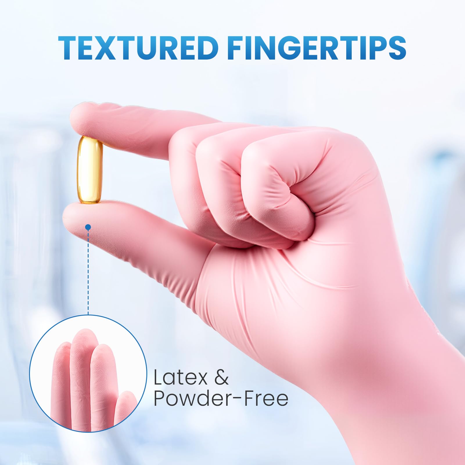 - Pink nitrile gloves are ambidextrous and disposable, designed for single use. They come in a convenient dispenser box containing 100 gloves by weight