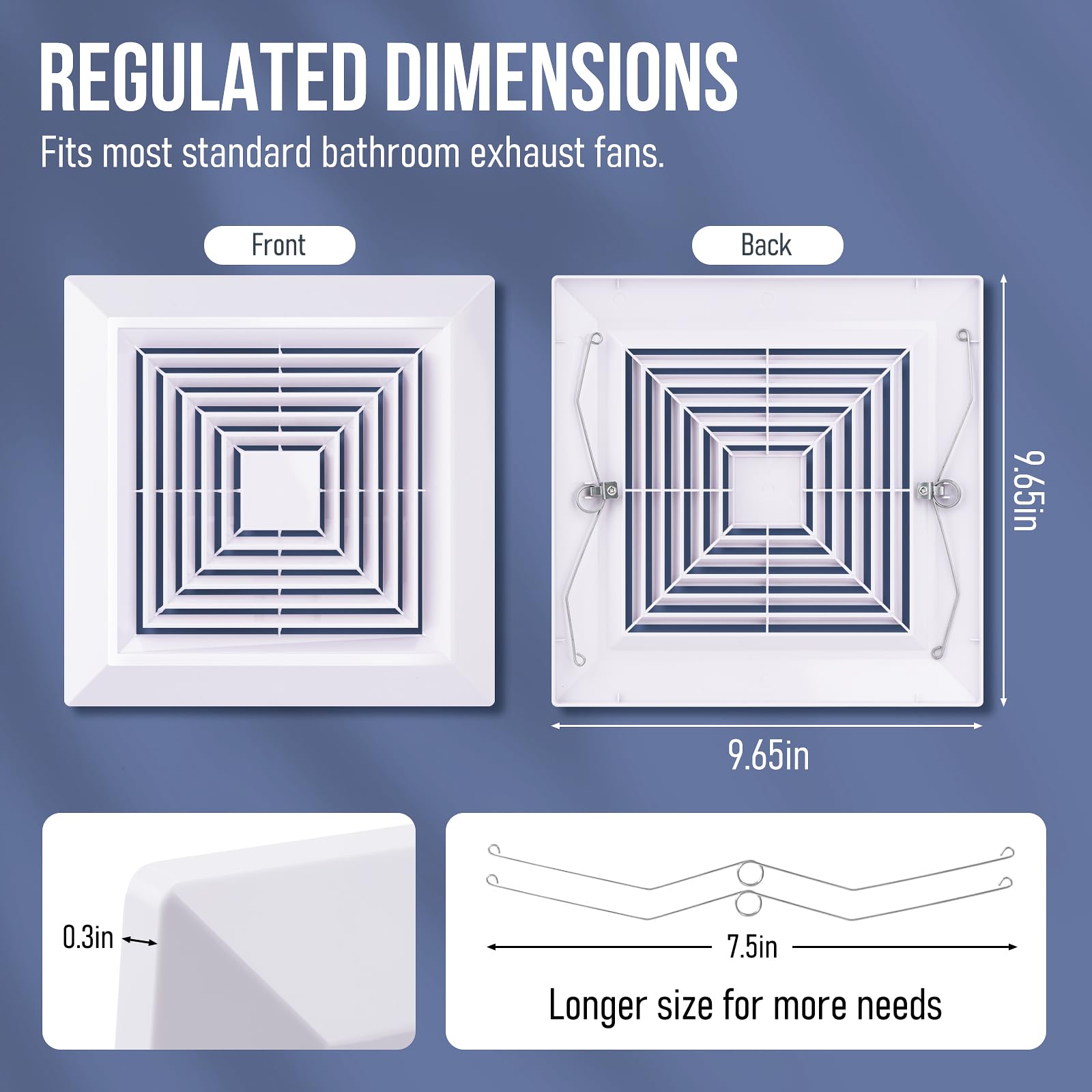 - Size: 1 fan covers per pack, enough for multiple bathrooms in your home; The panel size is about 9 x 9 x 0.3 inches, and the distance between the 2 springs is about 7.5 inches. before buying, we recommend checking the size of your ventilation fan grille to ensure compatibility with your fan exhaust.
