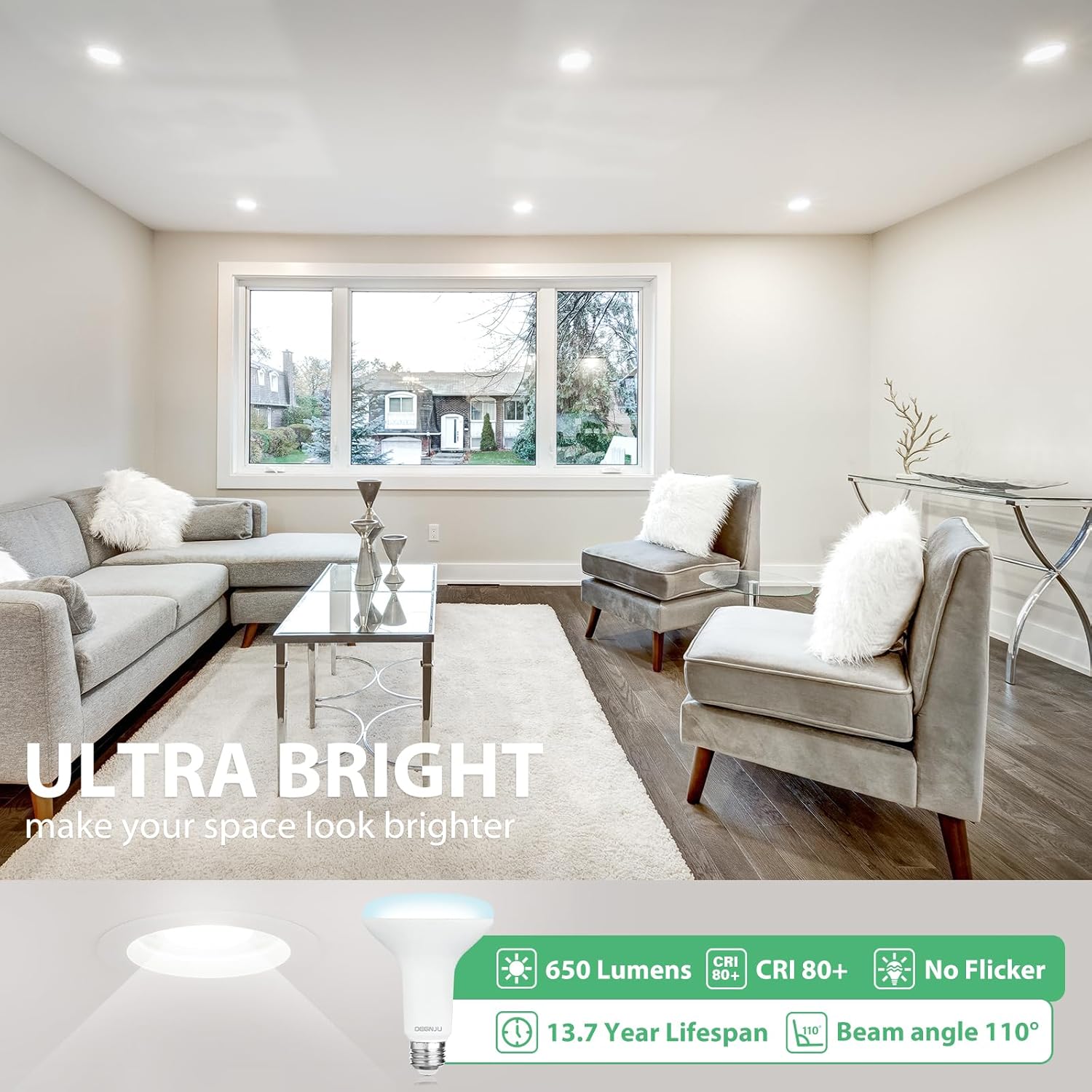 - 【EXCELLENT BRIGHTNESS】Indoor BR30 LED flood light features advanced LED technology, emitting 650 lumens of bright 2700K soft white light, also has high CRI 80+ and a wide 110-degree beam angle, providing vibrant and realistic colors.